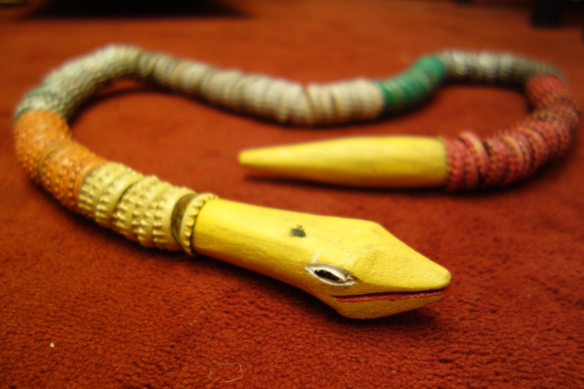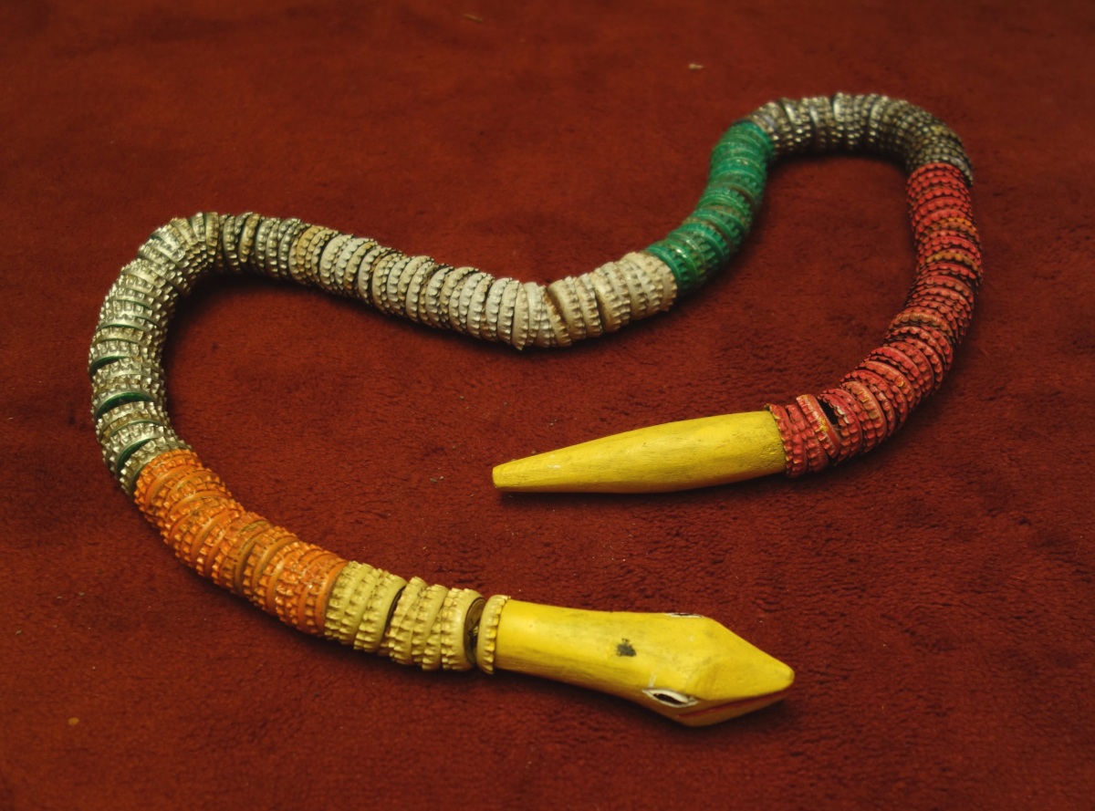 NIGÉRIA. MARIONNETTE articulée en forme de SERPENT en bois et capsules de bouteilles Coca-Cola, Guinness, Sprite, Sol