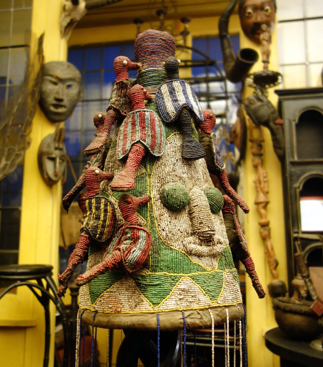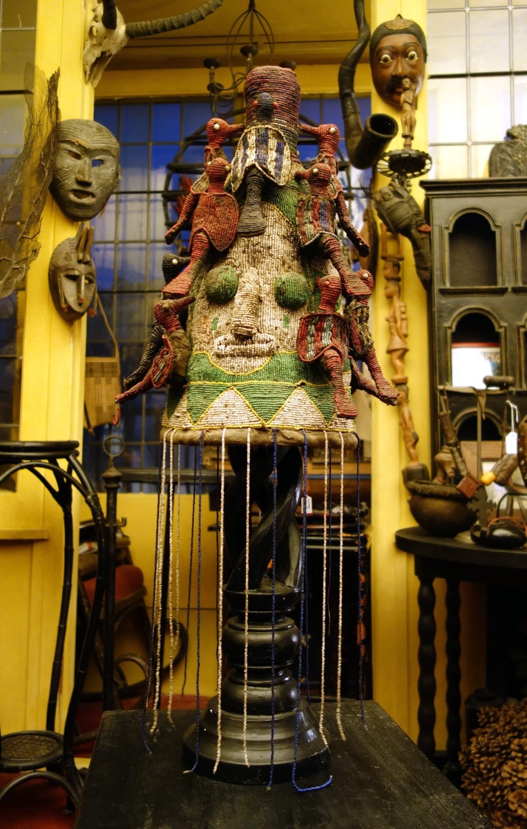 NIGÉRIA - YORUBA. COIFFE ROYALE ou ADE en perles, à décor d'oiseaux. Montée sur un socle en bois.