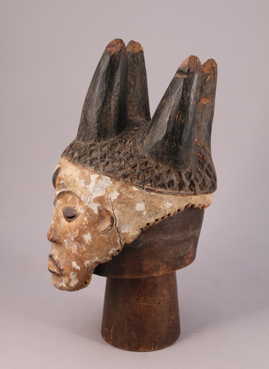 NIGÉRIA - IBO? MASQUE féminin à quatre cornes de la société MMWO en bois sculpté peint sur kaolin.