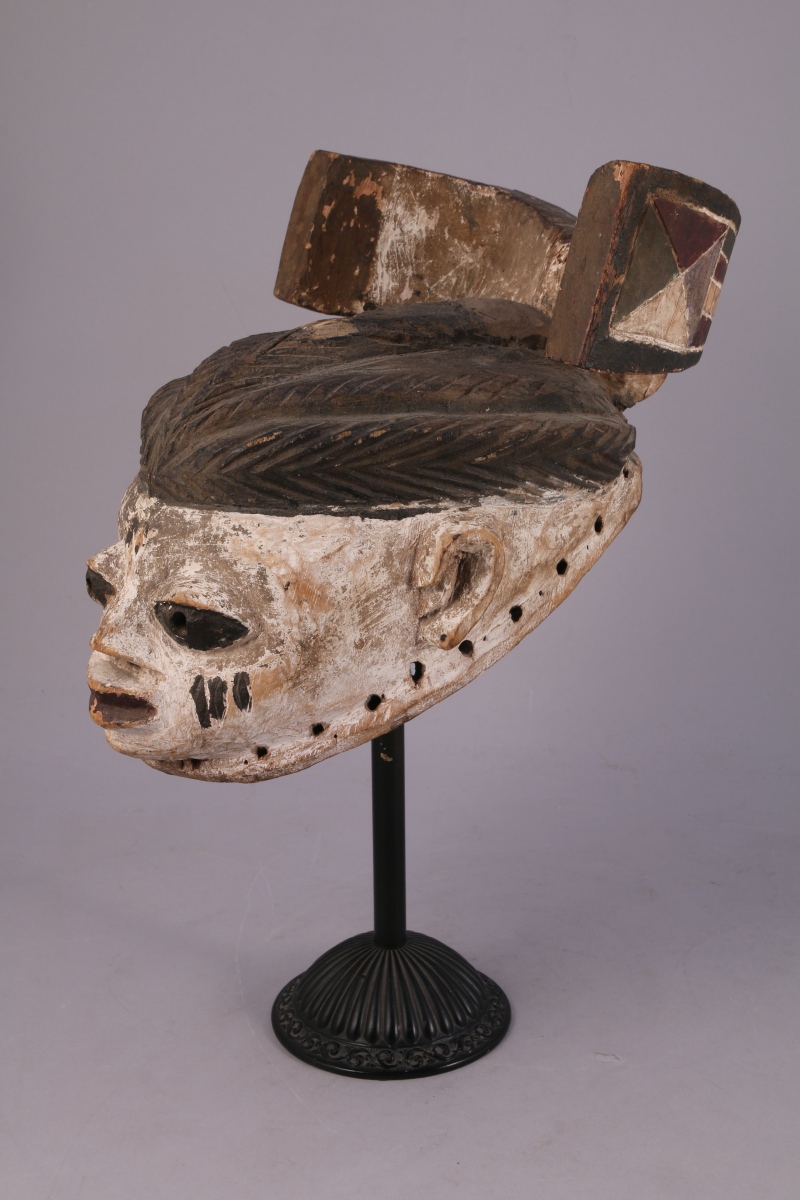 NIGÉRIA - YORUBA? MASQUE-HEAUME en bois sculpté et kaolin, sommé d'une coiffe à décor géométrique polychrome.