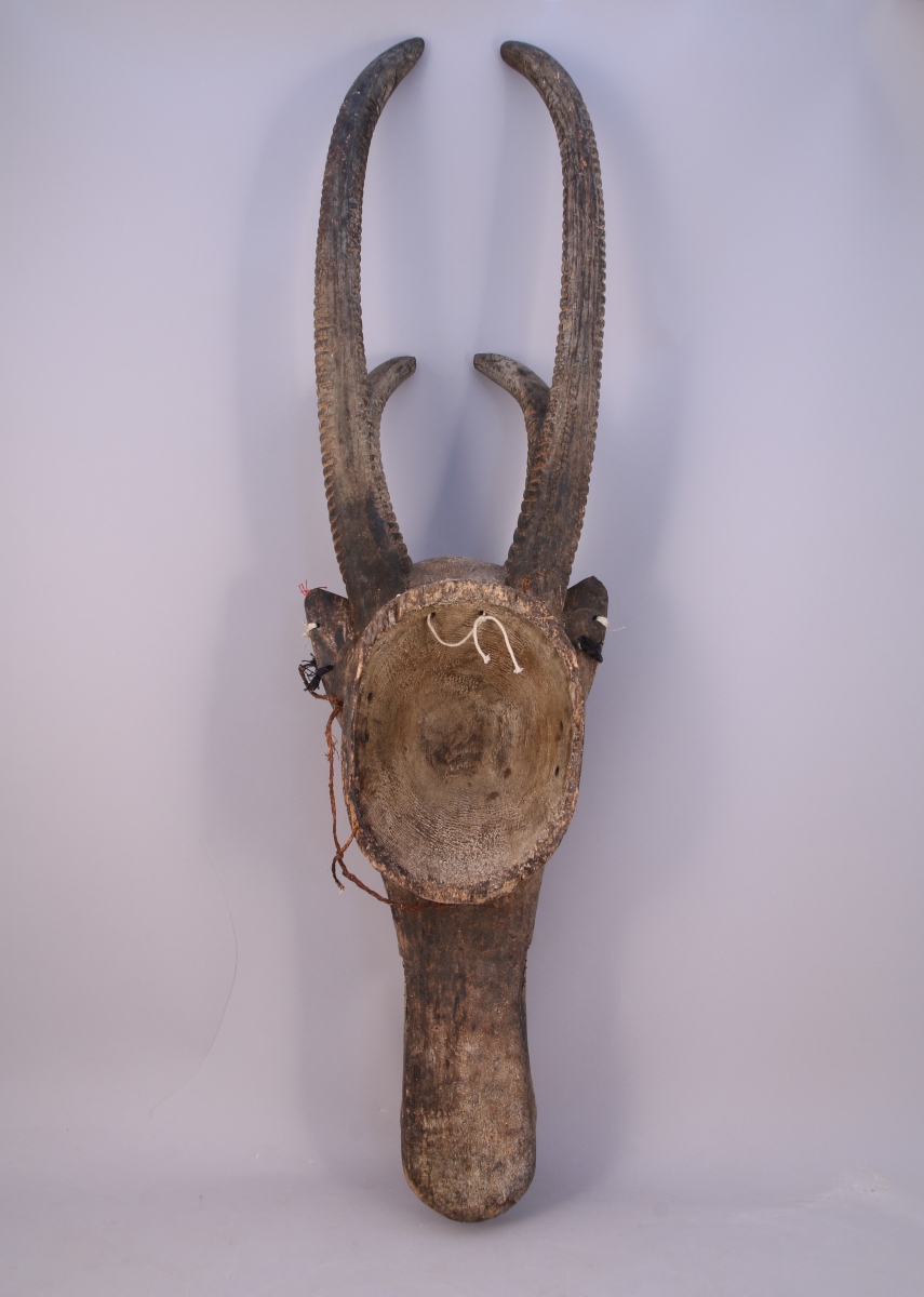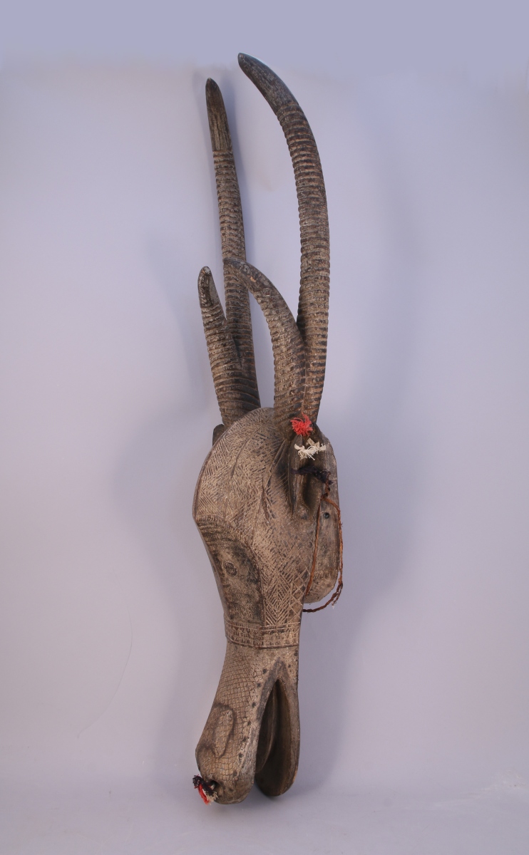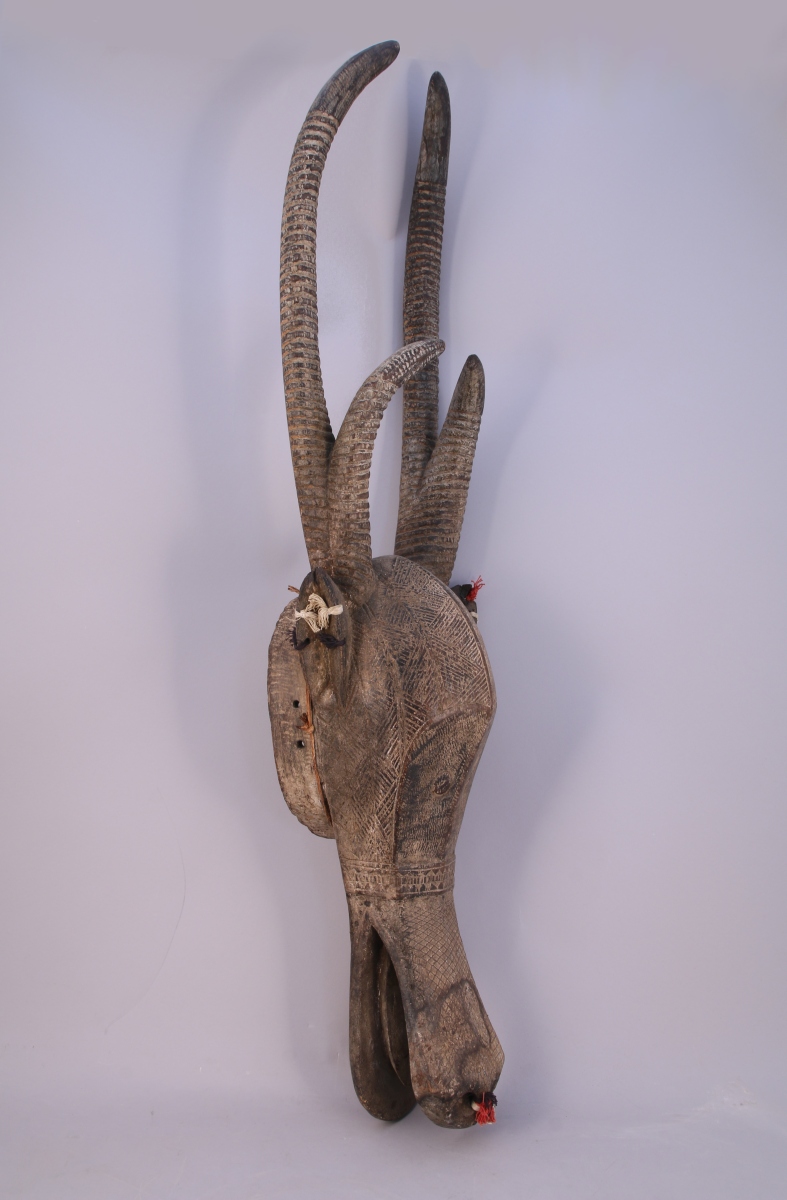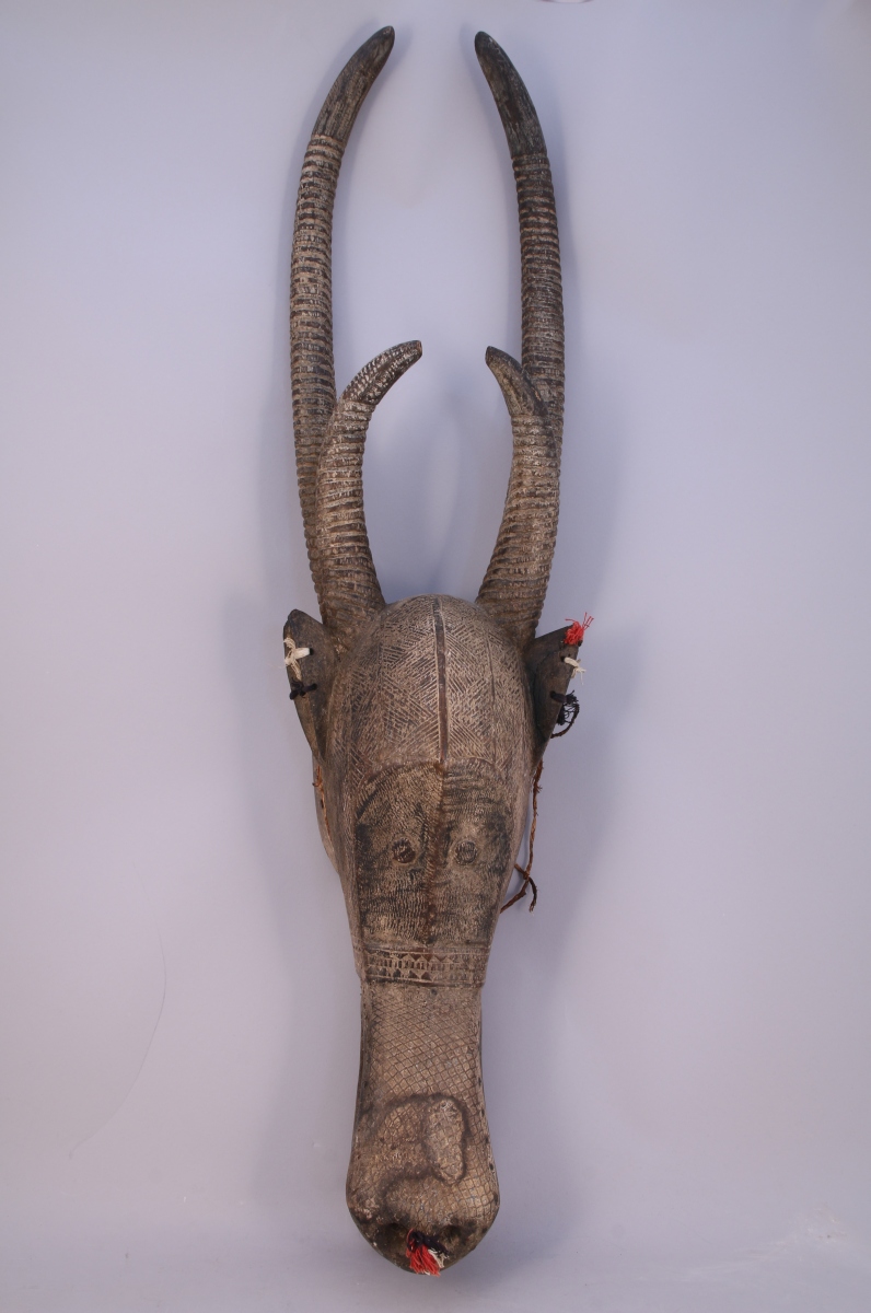 CÔTE d'IVOIRE - YAOURÉ? MASQUE ZOOMORPHE à quatre cornes en bois sculpté et tissus, des motifs géométriques sur l'ensemble du masque.