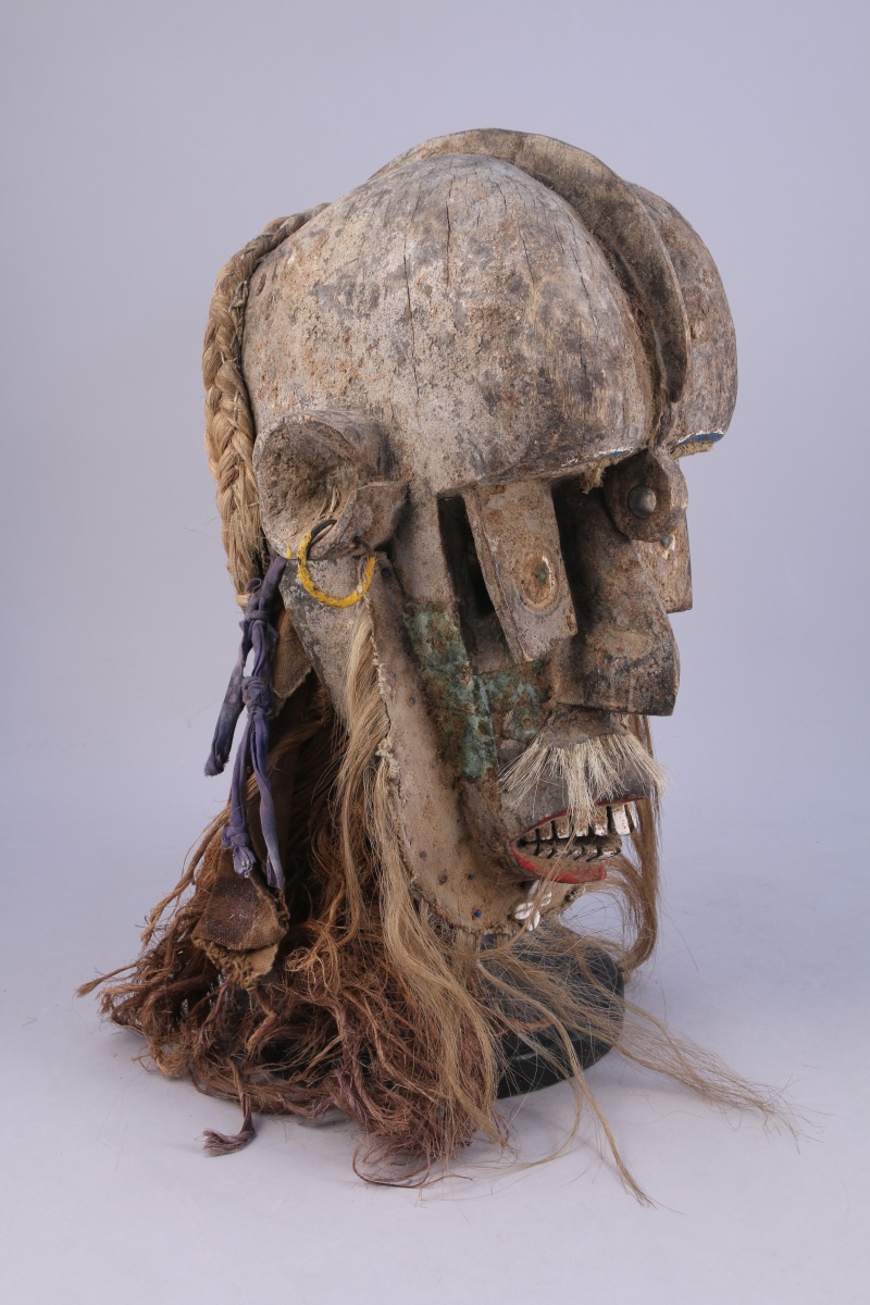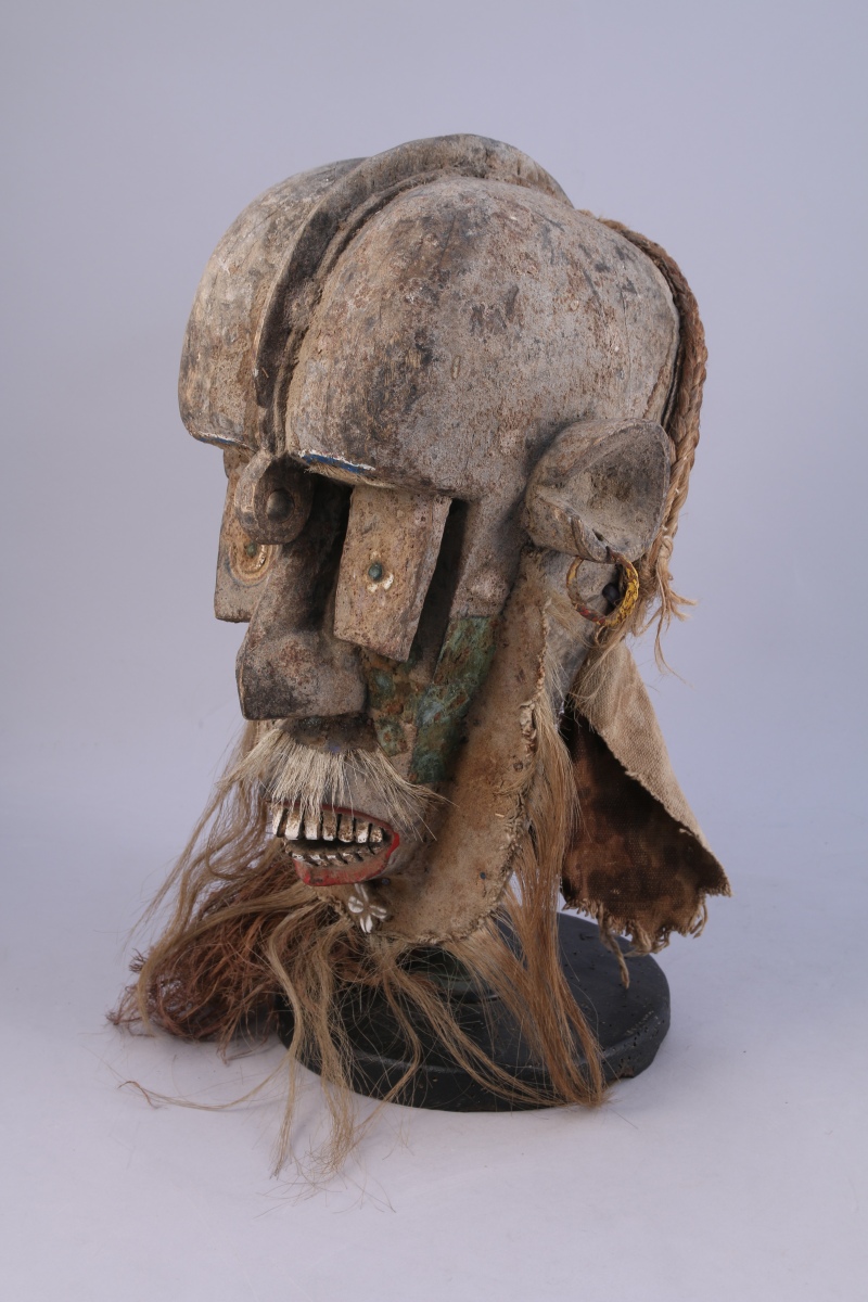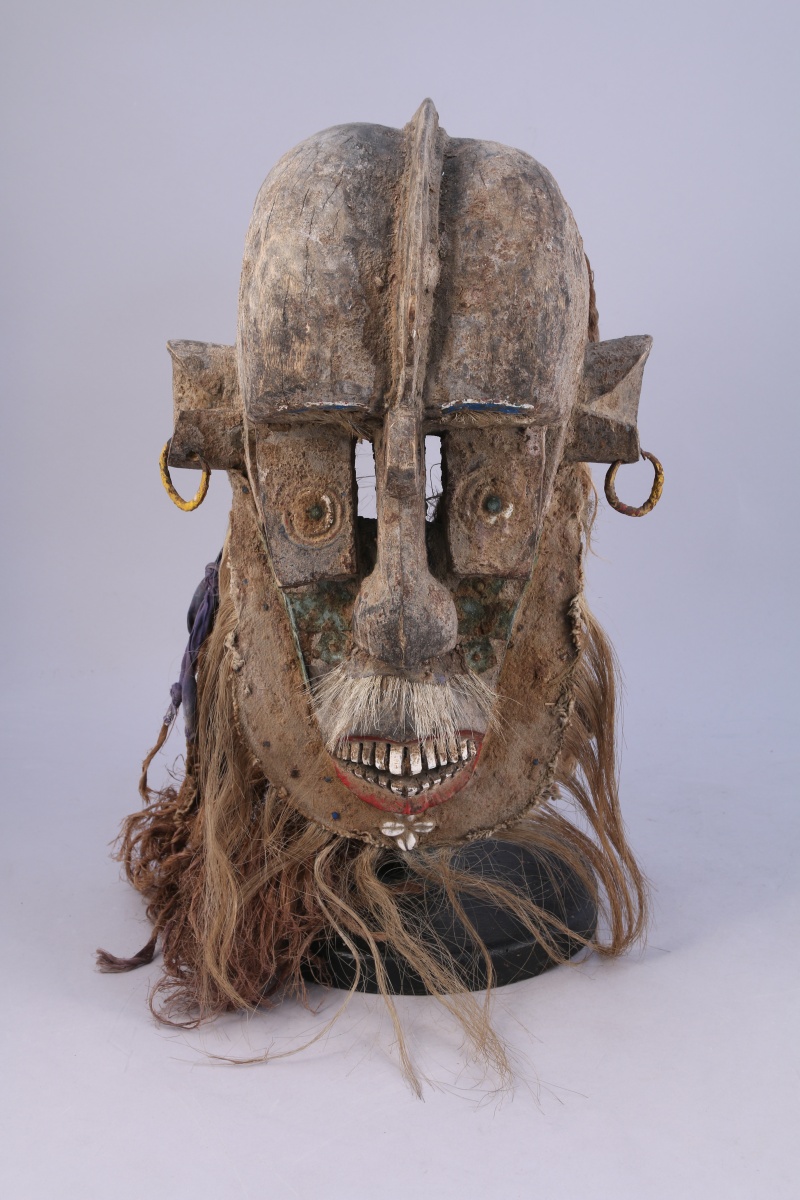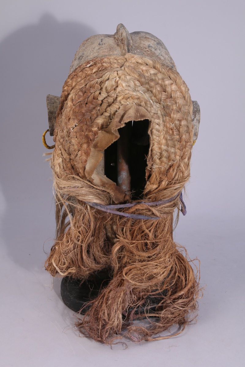 CAMEROUN - BAMBARA. MASQUE de GUÉRISSEUR en bois sculpté, fibres, cauris et fer.