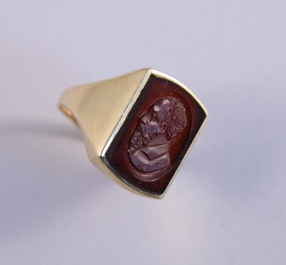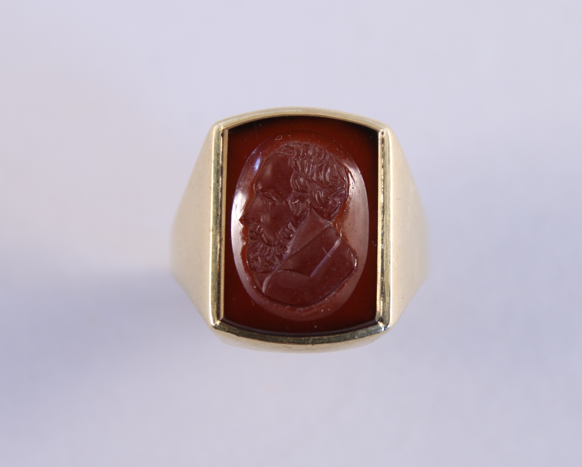 BAGUE-CHEVALIÈRE en or jaune ornée d'une intaille en cornaline figurant un homme barbu en buste de profil.