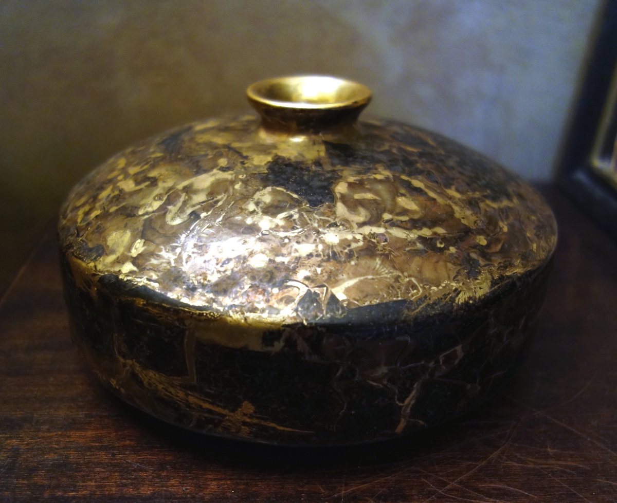 SUZANNE DAULIACH. Petit vase en porcelaine dorée à panse aplatie et petit col resserré.