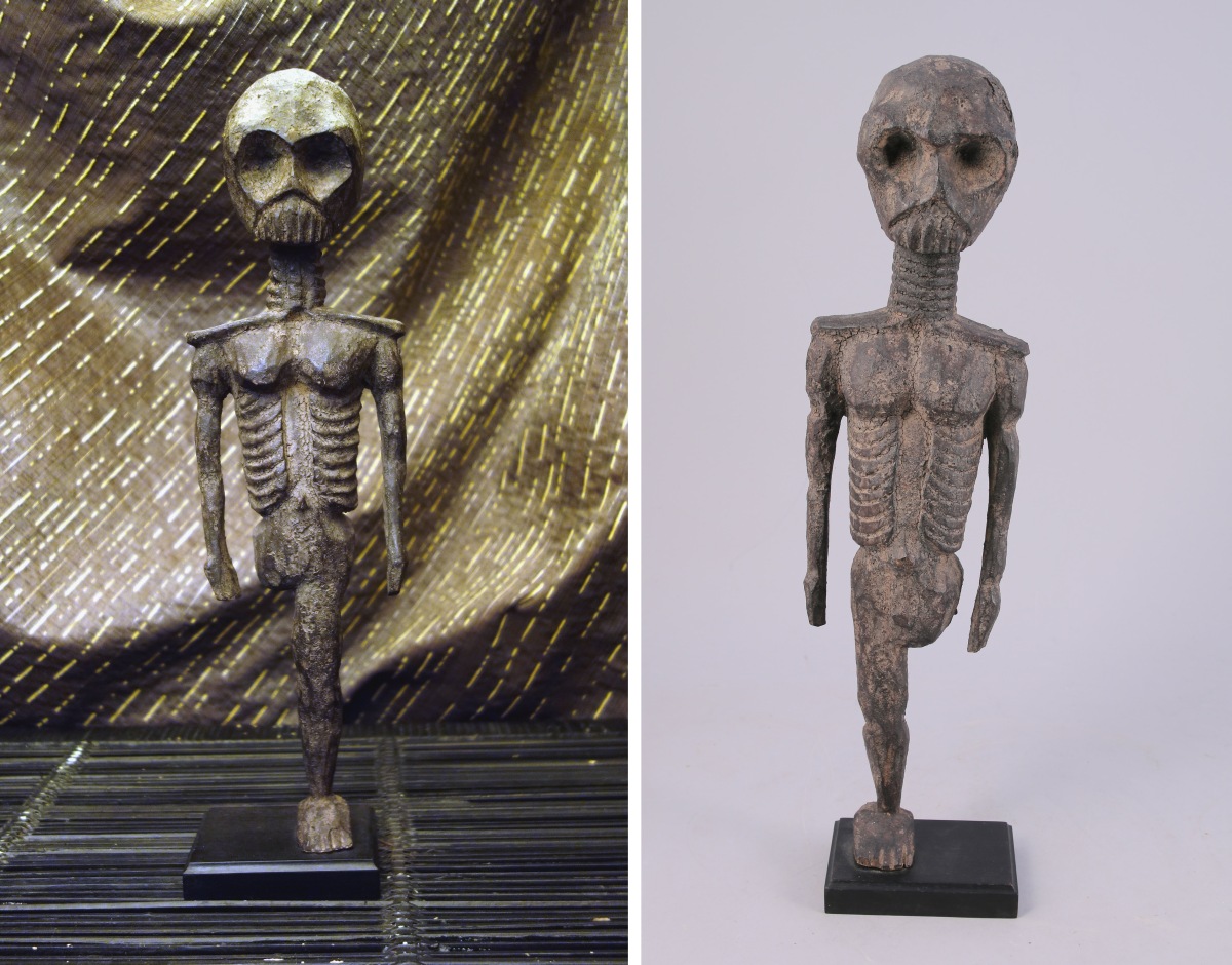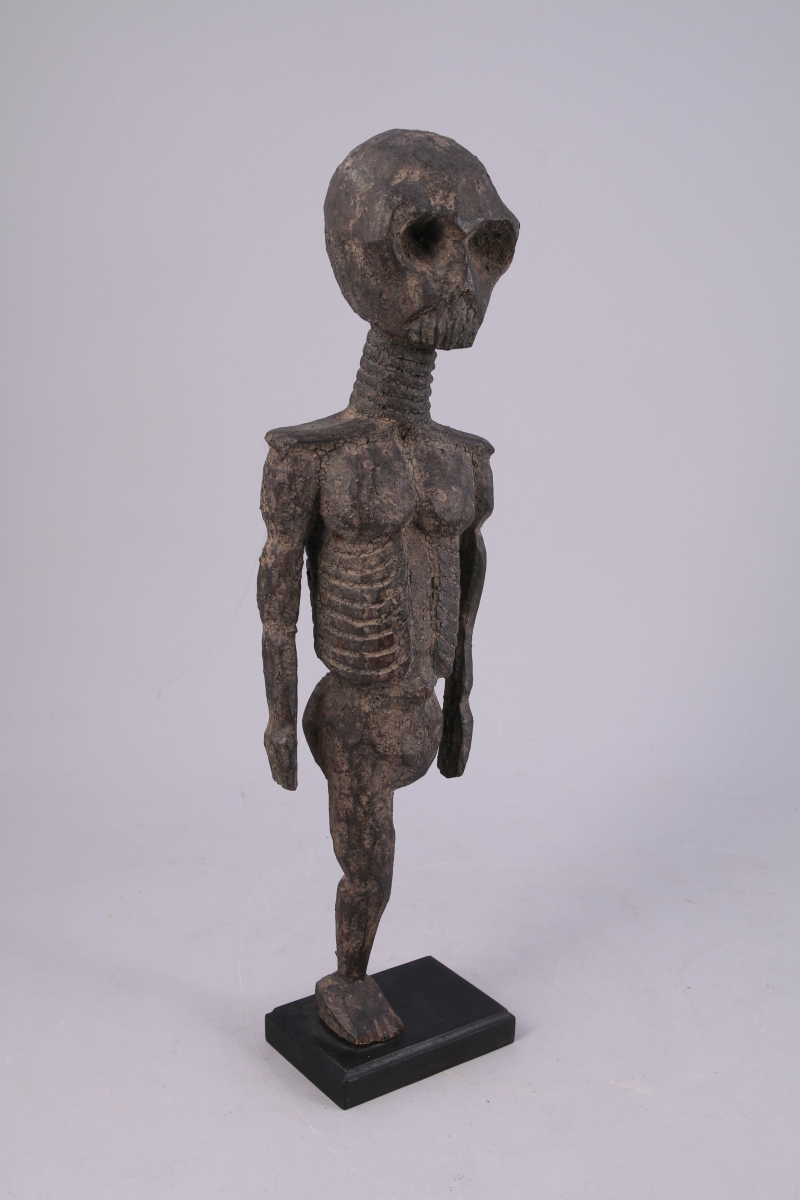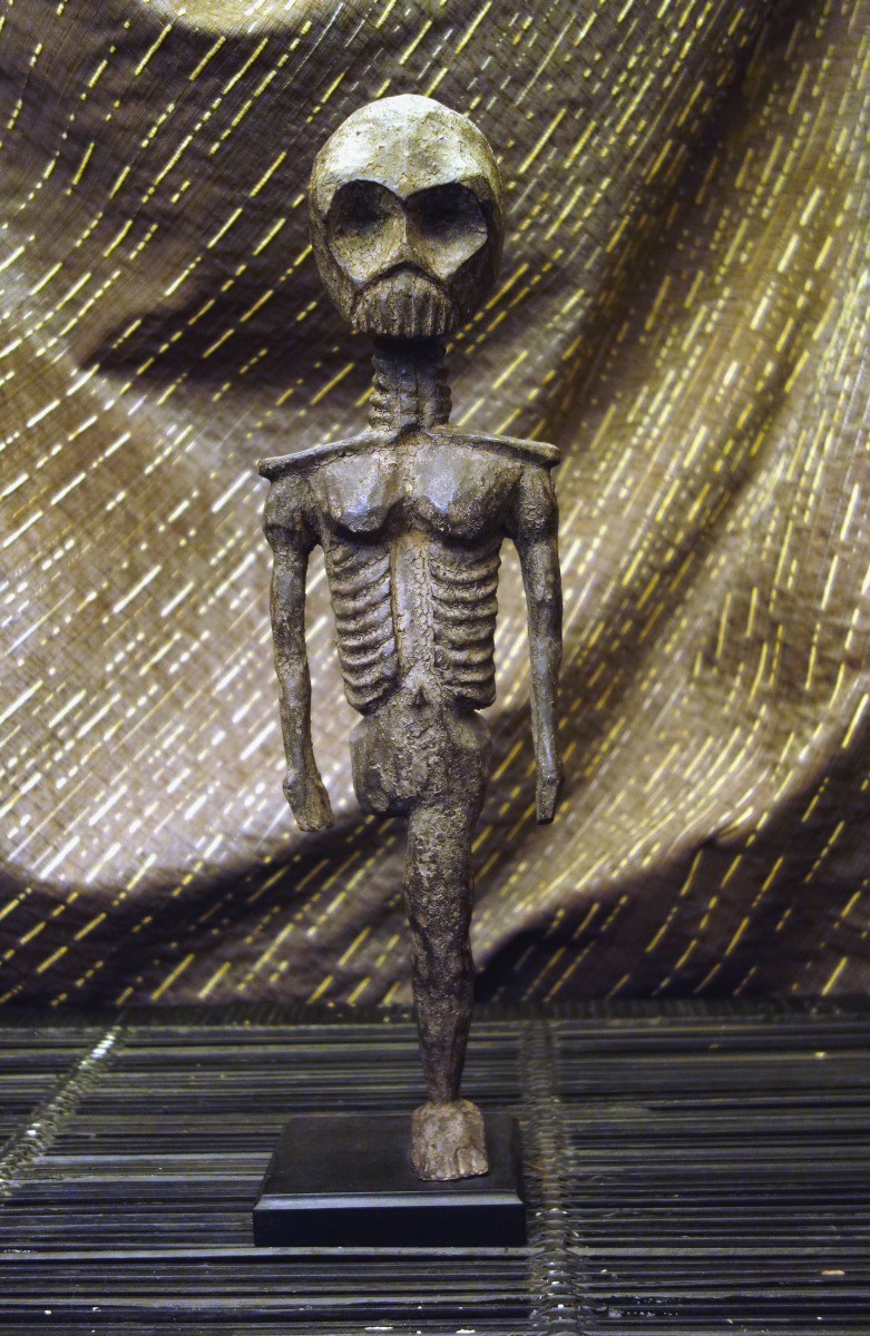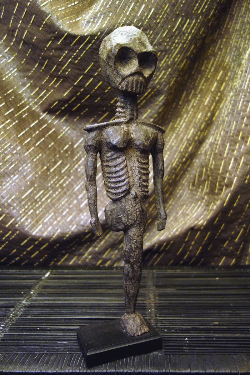 CURIOSITÉ. PAIRE de SQUELETTES unijambistes en bois sculpté et patiné....