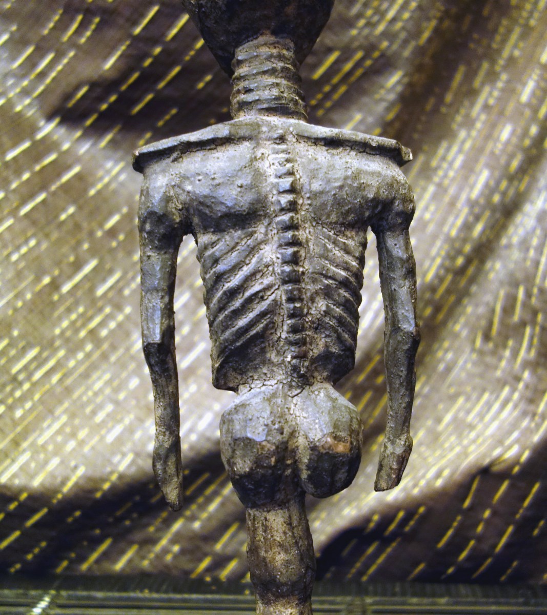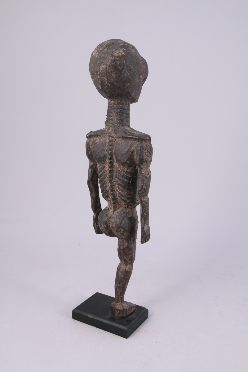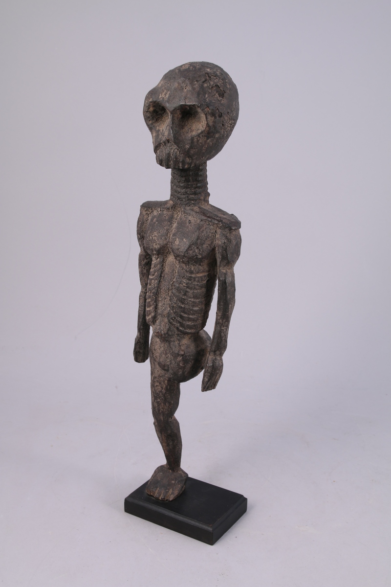 CURIOSITÉ. PAIRE de SQUELETTES unijambistes en bois sculpté et patiné. Sur un socle en ébène.