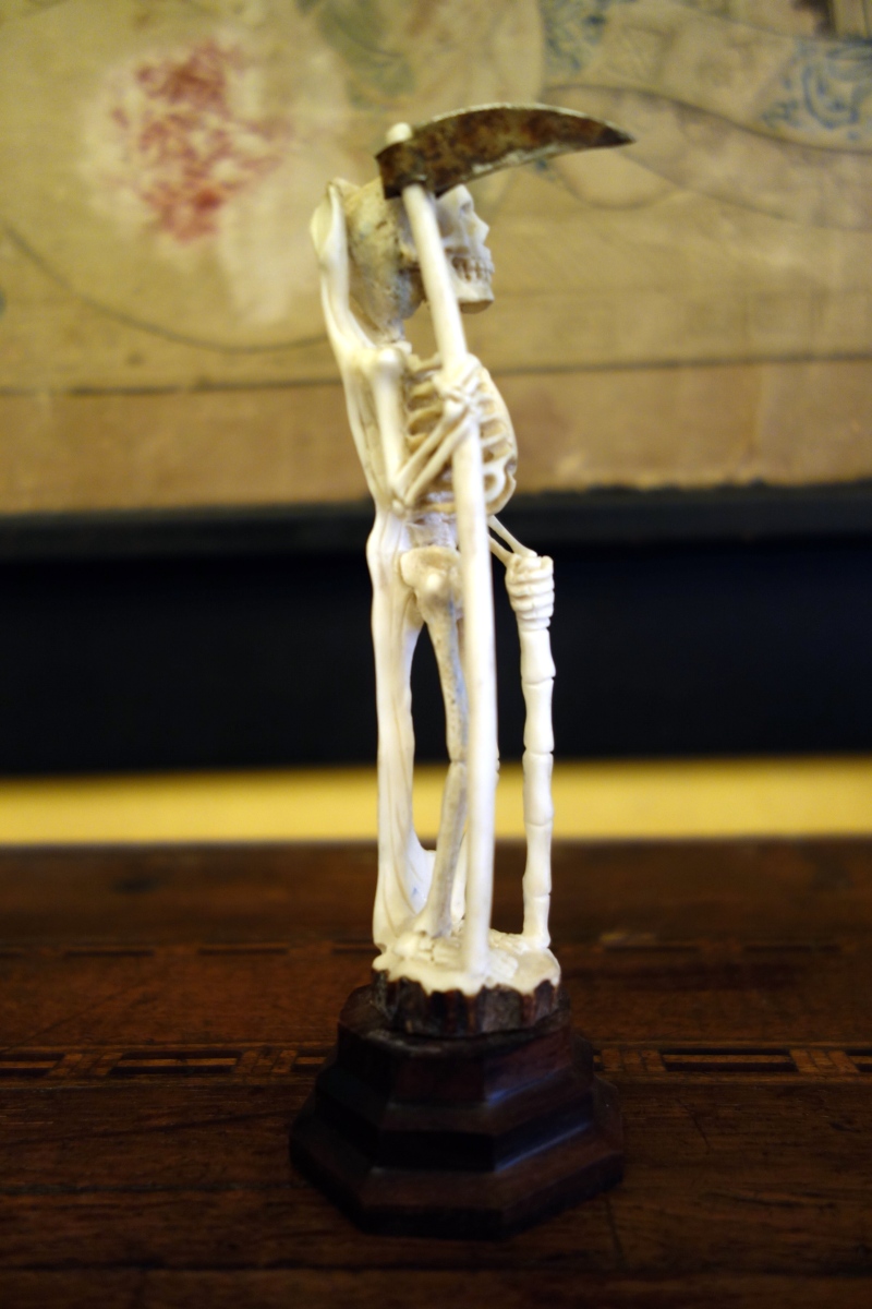 CURIOSITÉ. DEUX VANITÉS en os sculpté, l'une figurant la mort avec sa faux appuyée sur un bambou, l'autre figurant un squelette rieur dansant.