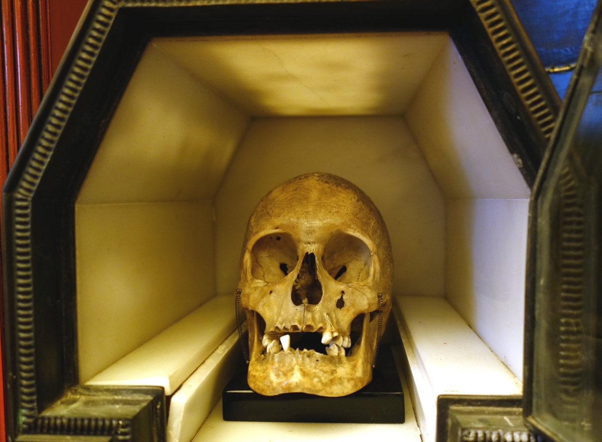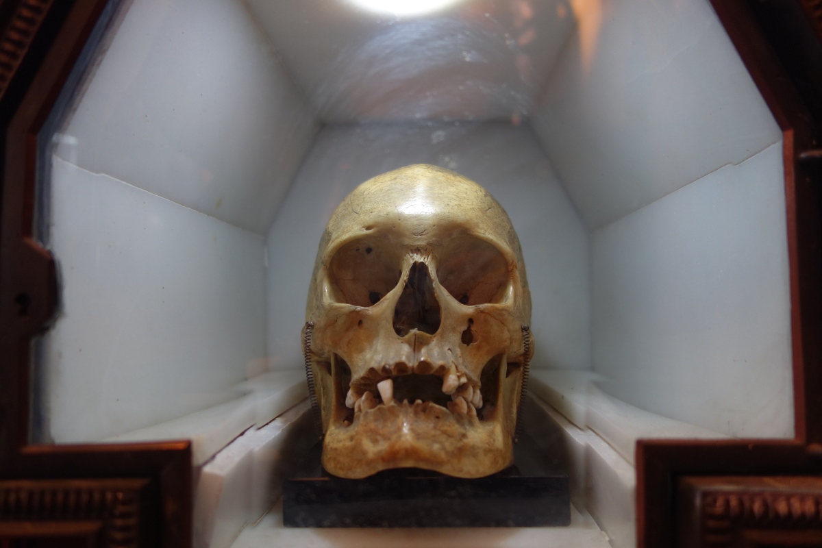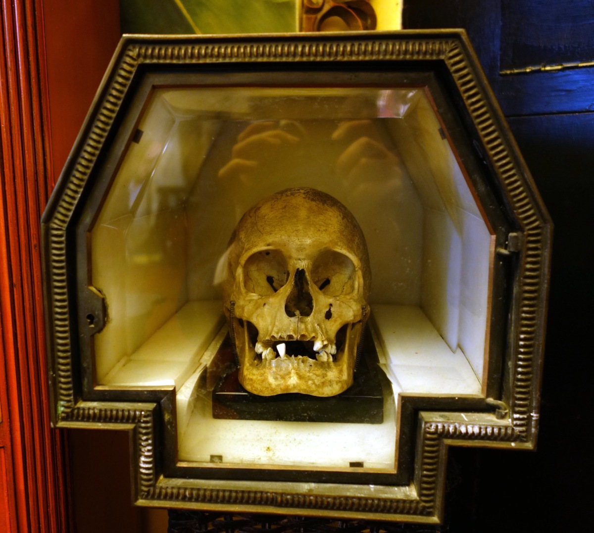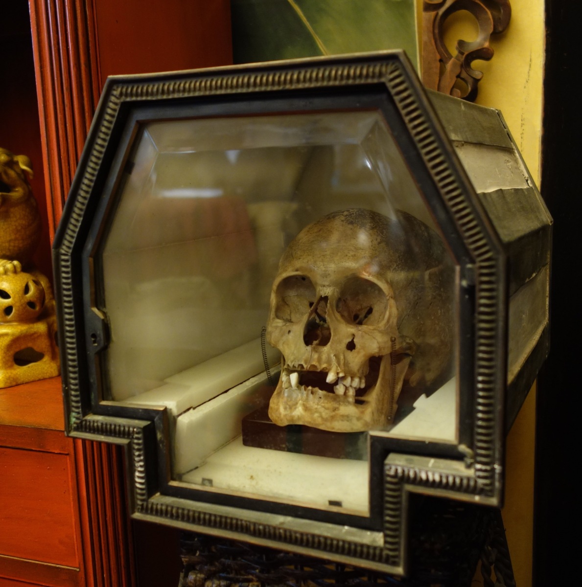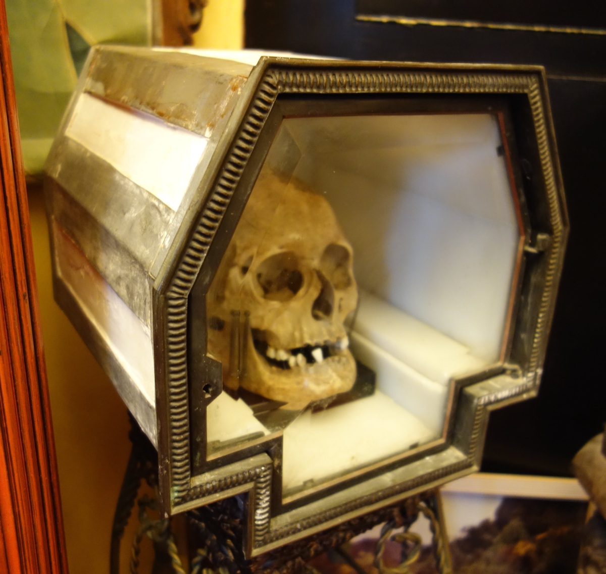 CURIOSITÉ. RELIQUAIRE en albâtre et métal, ouvrant à une porte en verre biseauté, pour conserver dans une lumière mystérieuse le chef d'un saint moine.