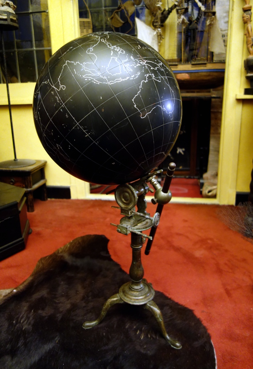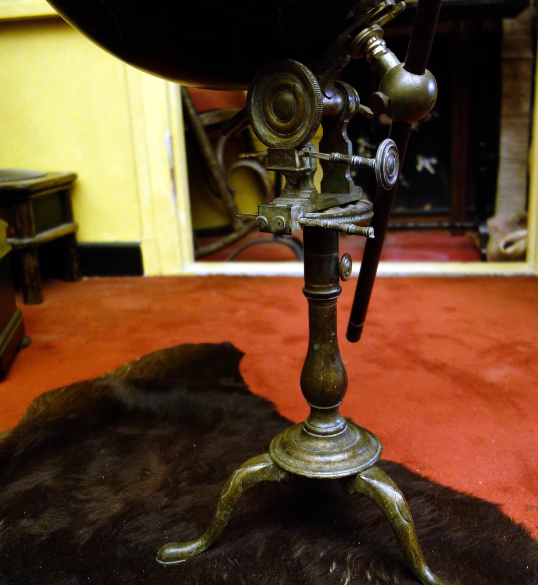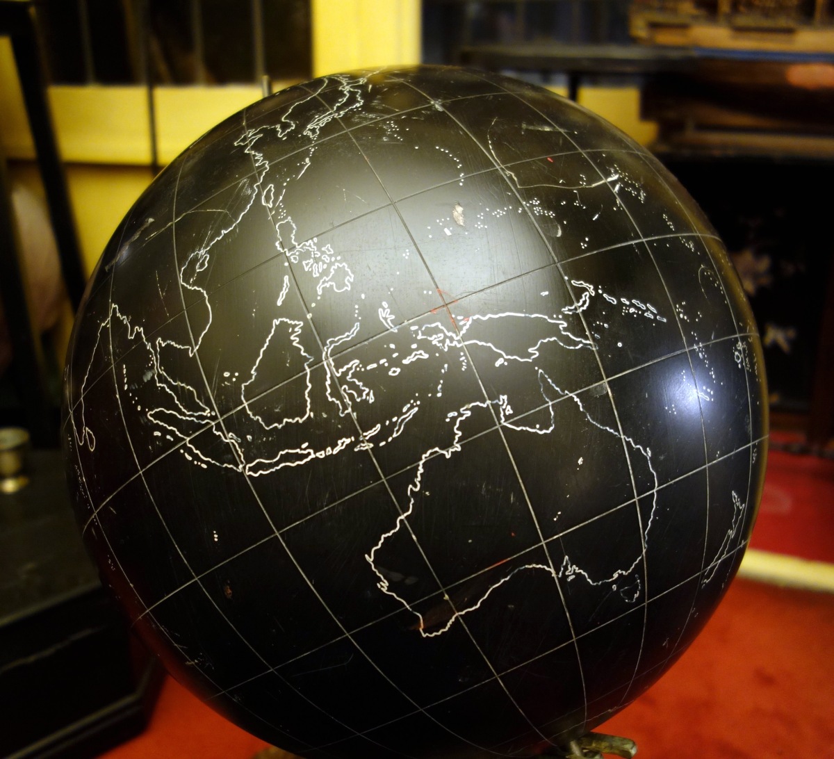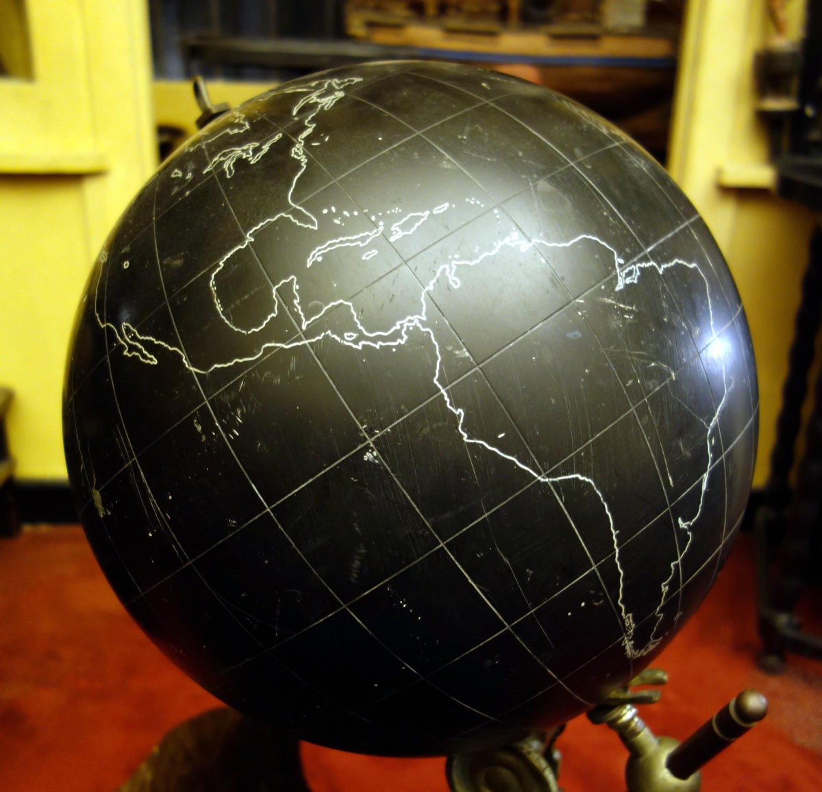 MAPPEMONDE sur fond noir et figures banches. Le pied déployant et reployant.
