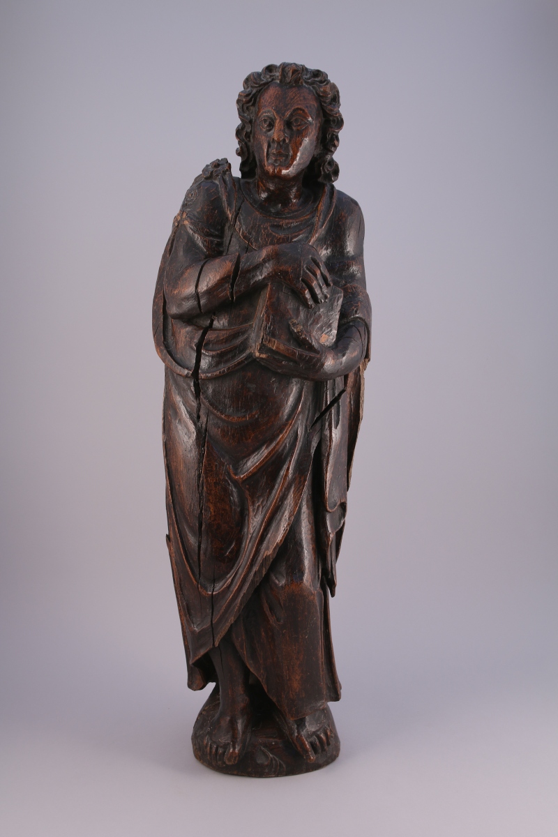 SAINT en bois sculpté et teinté, tenant un livre, vêtu d'une tunique retenue par des trois agraphes-fleurs.