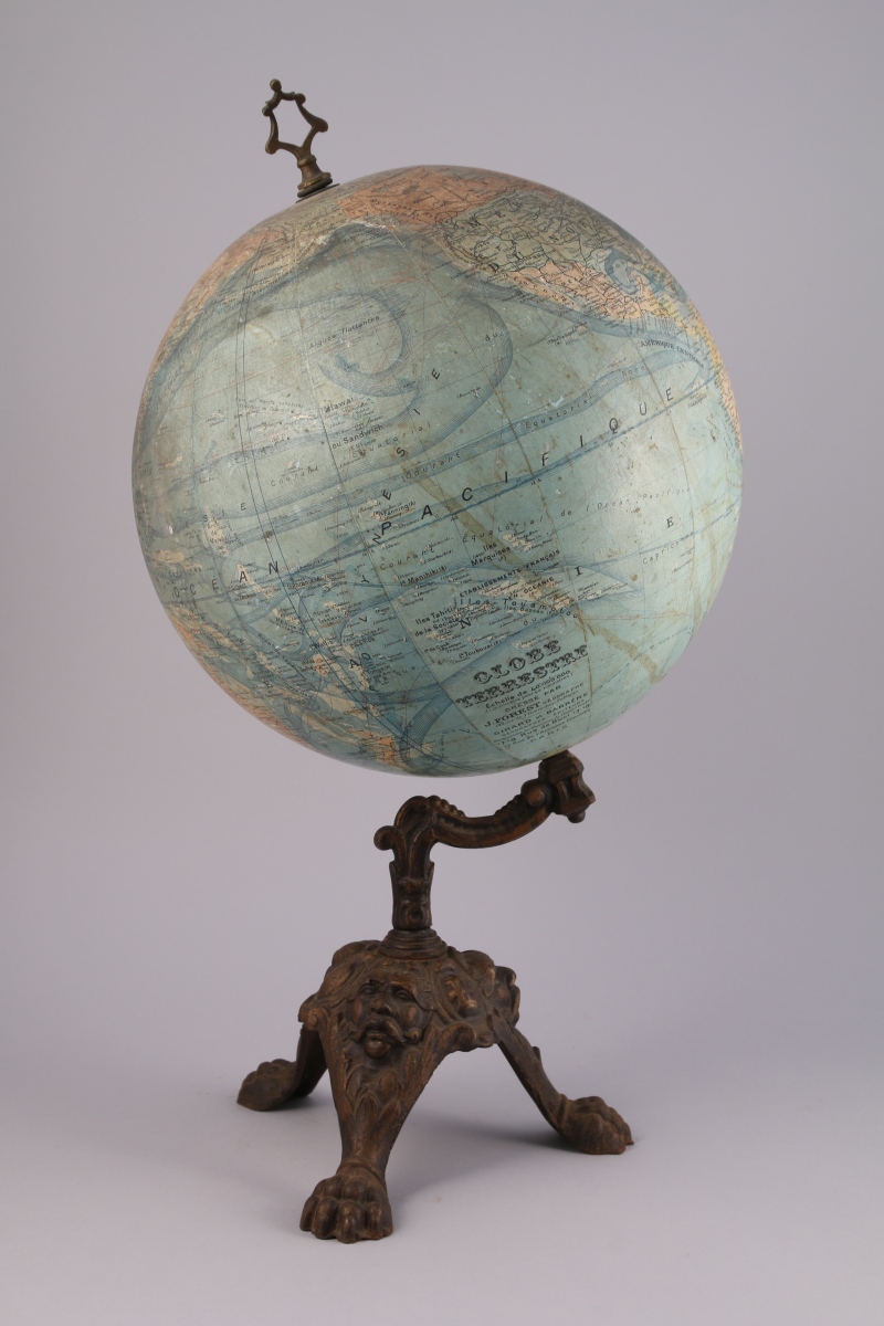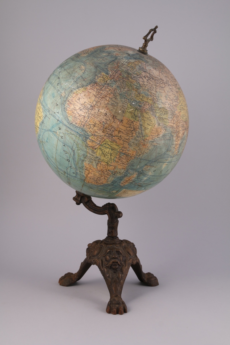 GLOBE TERRESTRE polychrome dressé par " J.FOREST GÉOGRAPHE-OFFICIER DE L'INSTRUCTION PUBLIQUE". Piètement tripode en fonte anciennement doré, à décor de pattes de lion et masques de faunes alternés de miroirs.