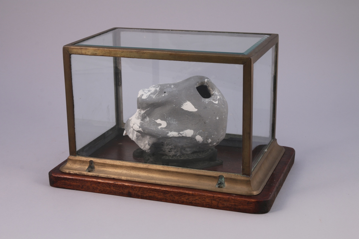 Haut. 11,5, Long. 16,5 cm. Présenté sur un heurtoir dans une boîte vitrée. Haut. totale 20, Long. 32, Prof. 21 cm.