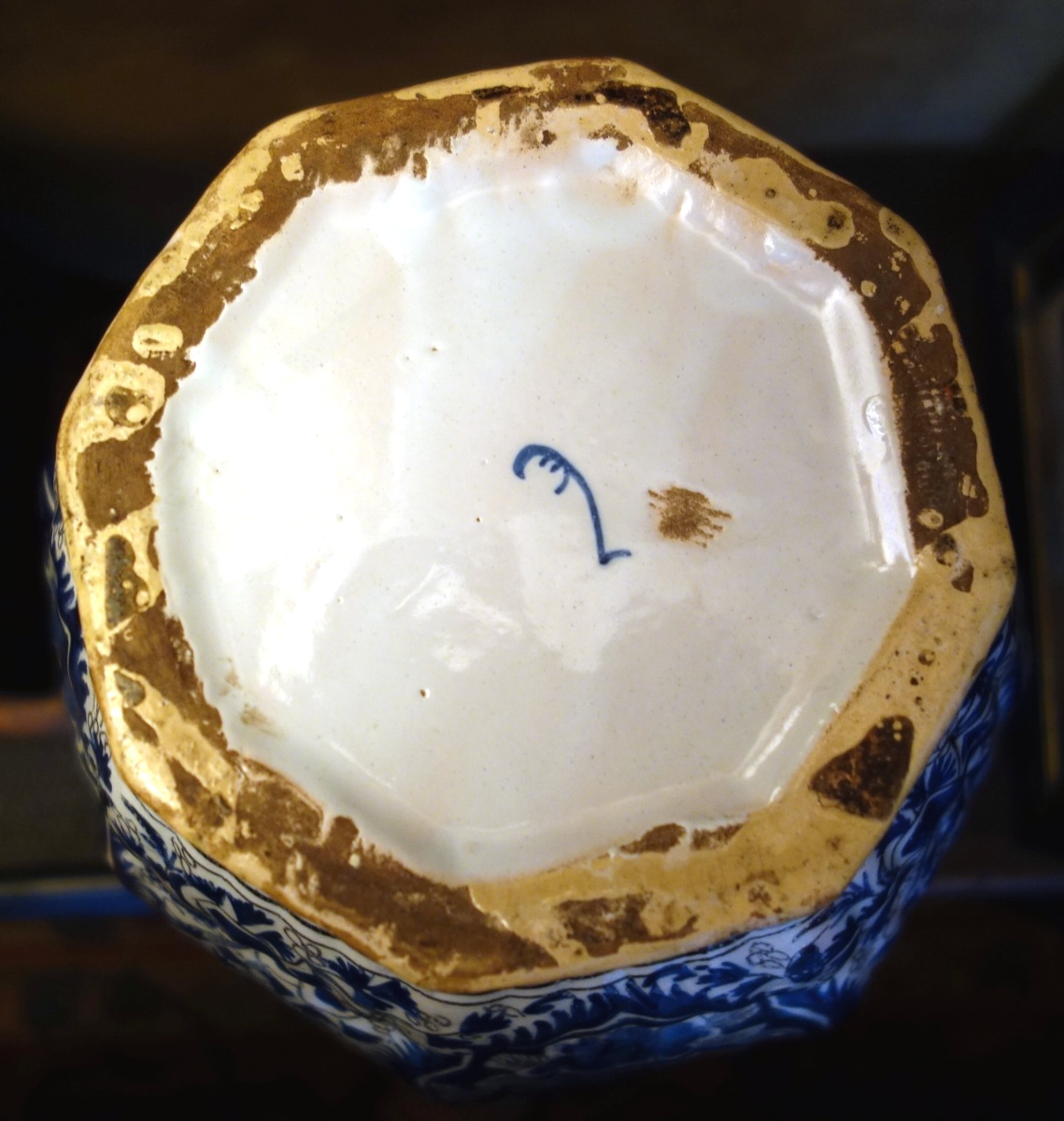 DELFT? POT COUVERT de forme octogonale en faïence bleu et blanche, le corps à pans coupés à décor de feuillages et de cartouches ornées de scènes de pêches et de bouquets. Le couvercle avec une prise en chien de phô. Signé.