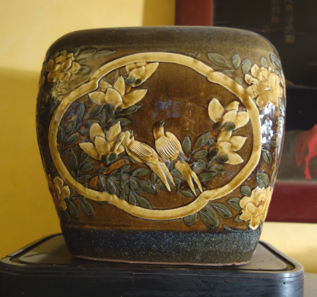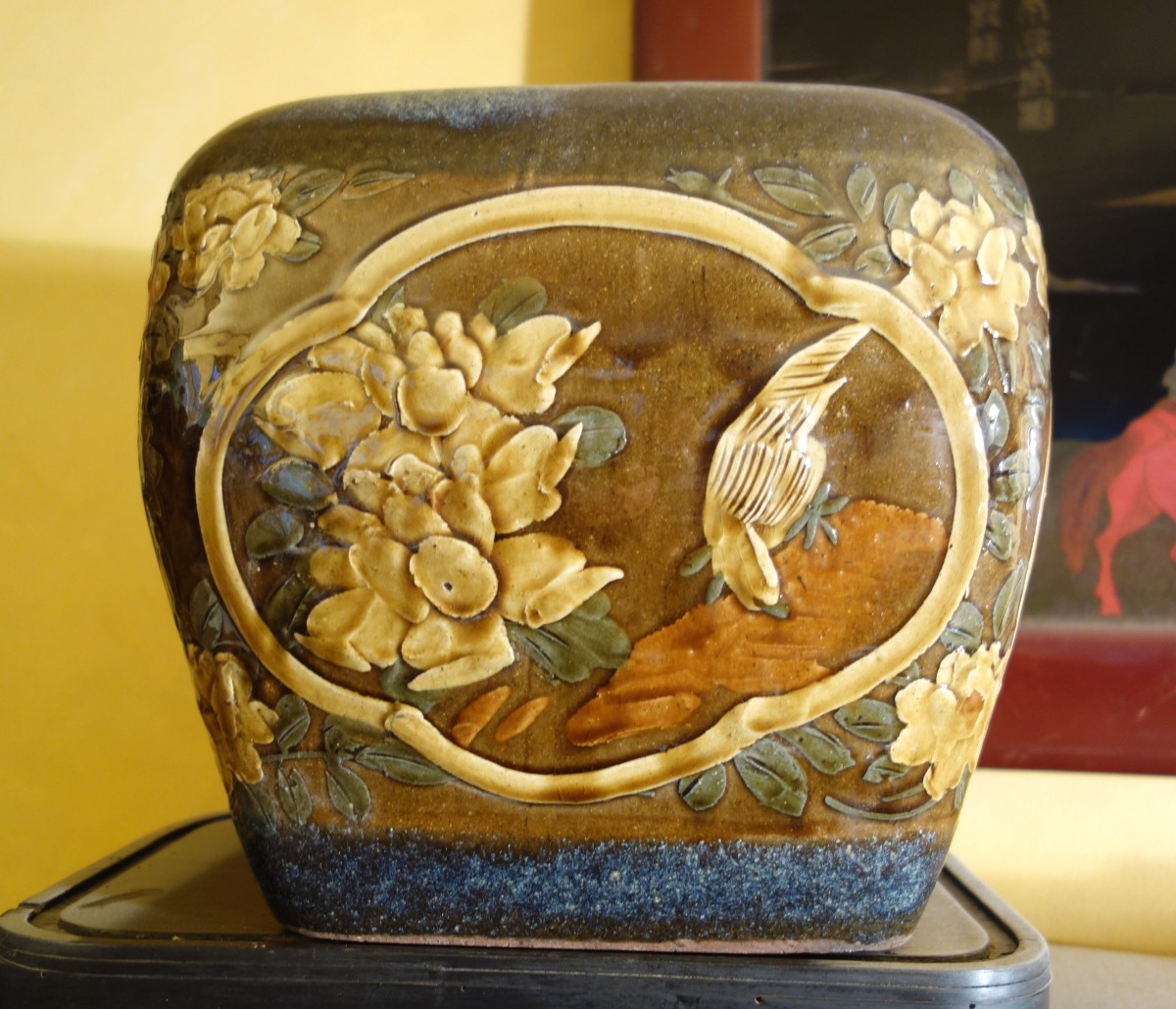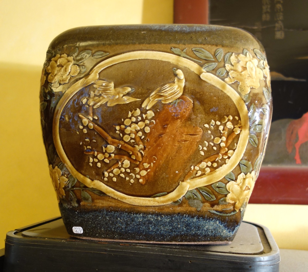 JARDINIÈRE cubique en faïence polychrome à décor de cartouches à oiseaux.