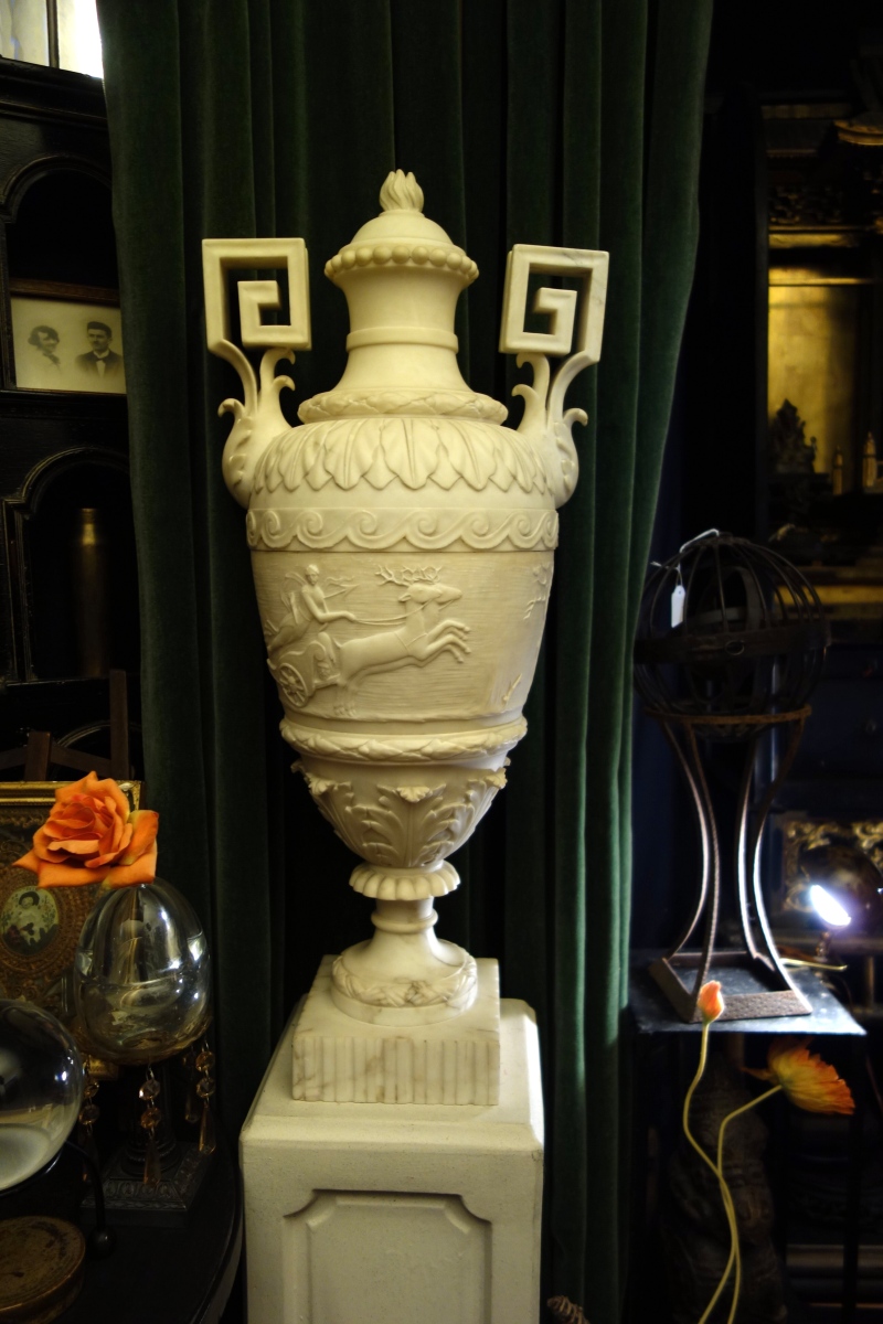 VASE en albâtre sculpté représentant Diane chasseresse, sur son socle.