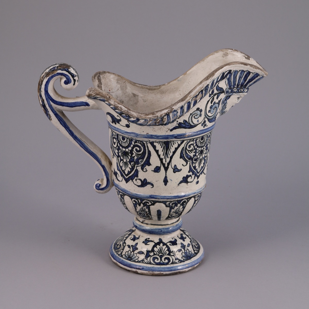 ROUEN. AIGUIÈRE-CASQUE sur piedouche en faïence bleu et blanc à décor de lambrequins fleuris, godrons. Le déversoir orné d'un masque d'homme barbu. Marquée R sous la base.