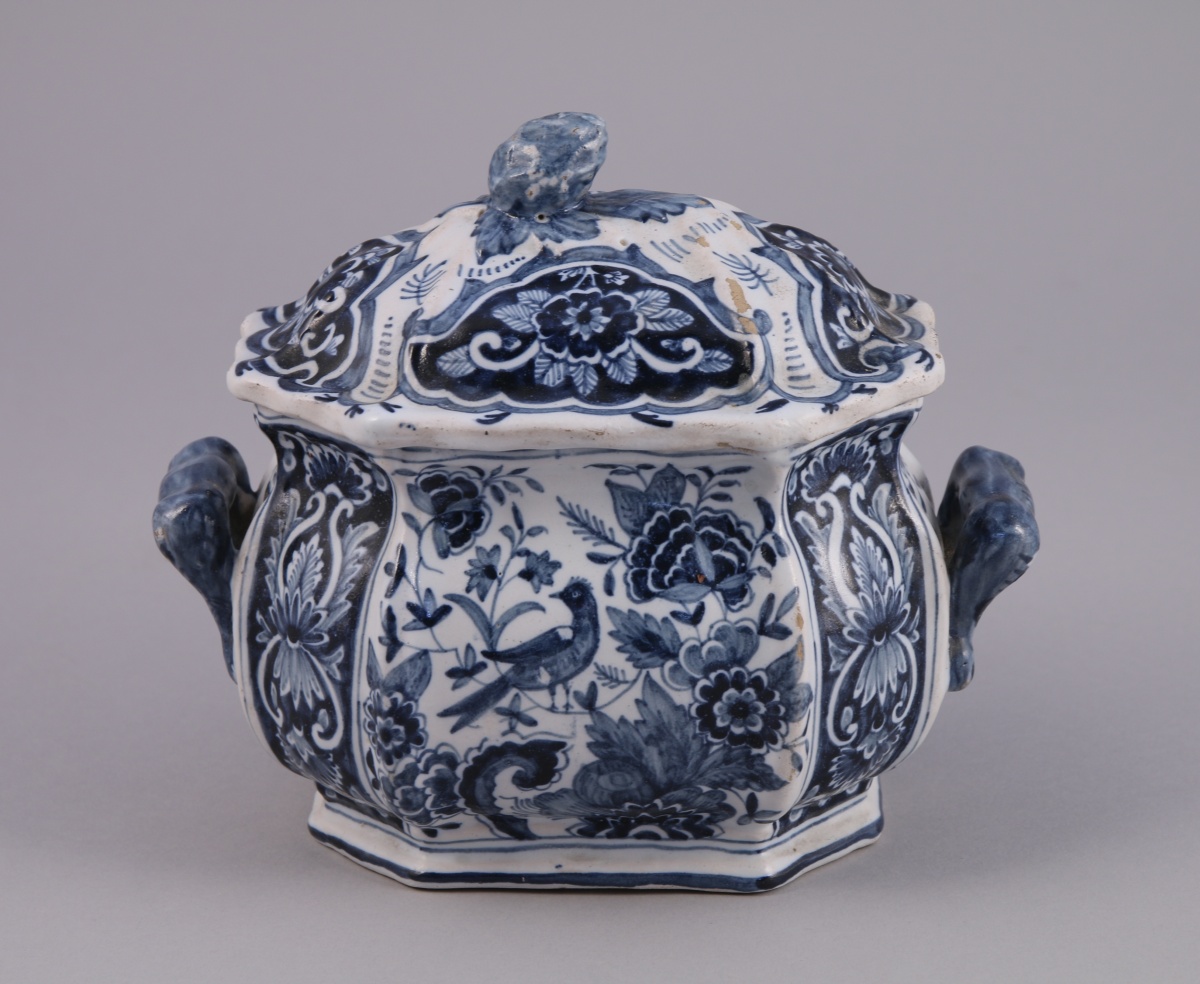 JOINT: SUCRIER genre Delft, couvert à anses en faïence bleu et blanc à décor d'oiseau dans des fleurs. Le frétel en forme de fruit. Marqué LF sous la base. Haut. 14,5 cm. (éclats à l'émail).