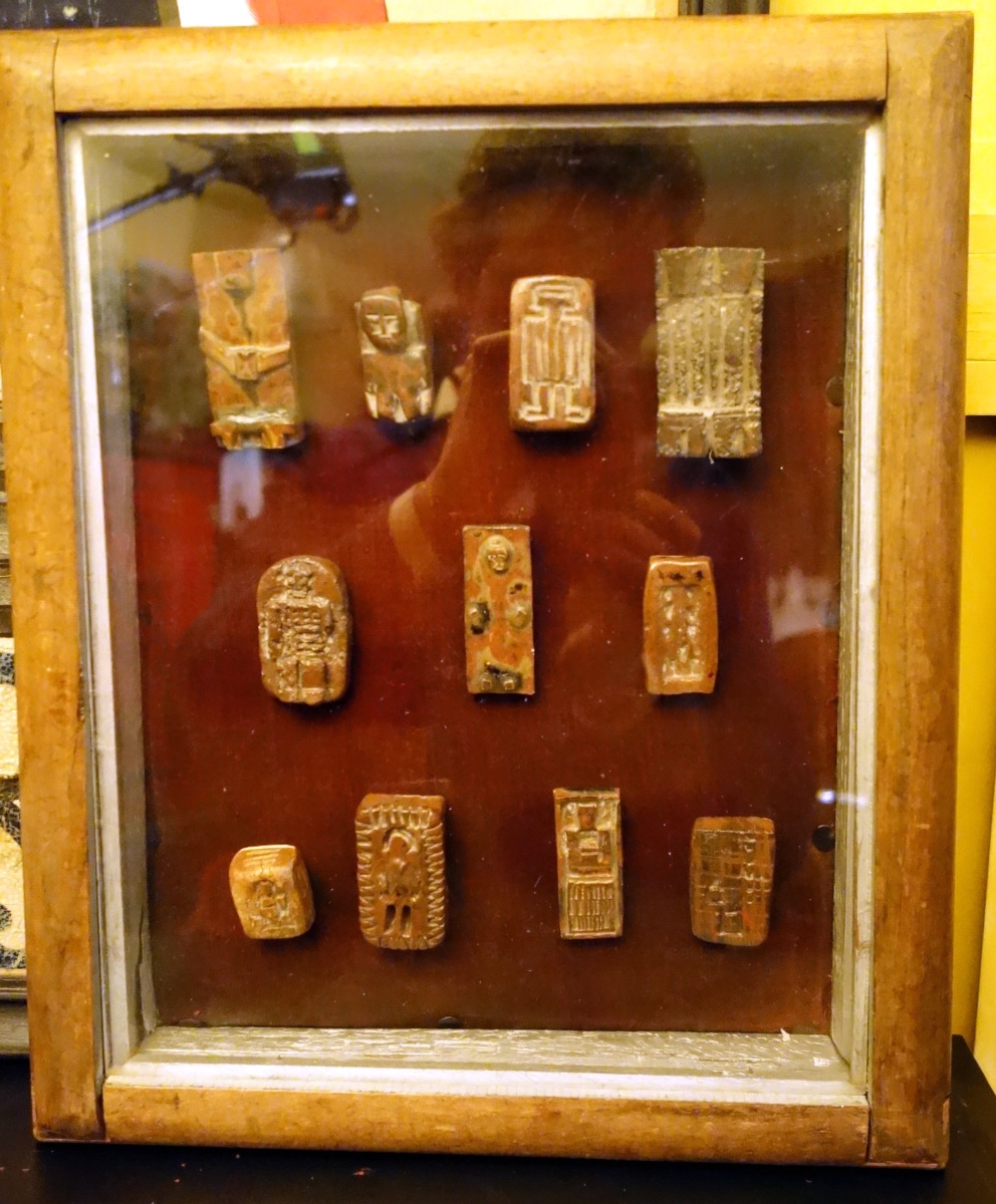 Gérard TIRY, assemblé par. Réunion de ONZE FIGURINES de forme rectangulaire en terre cuite à motifs anthropomorphes d'environ 5 cm.