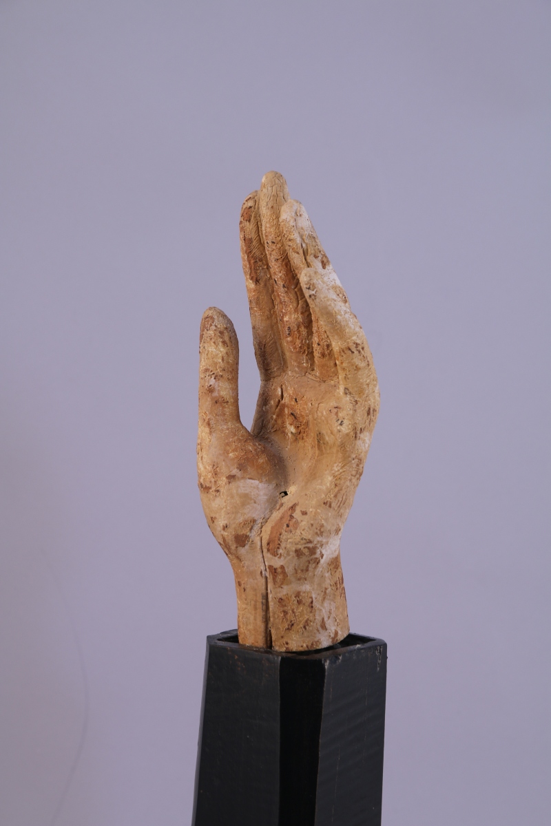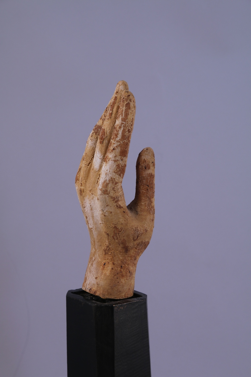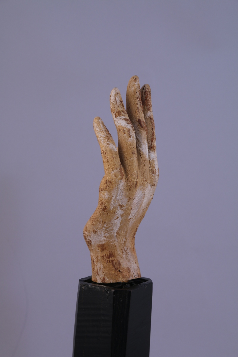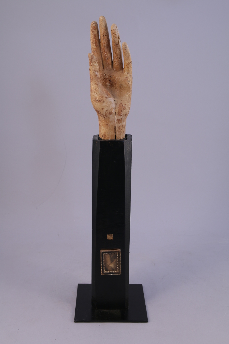 Gérard TIRY, assemblé par. BRAS RELIQUAIRE, la main en terre cuite sur un fût en bois noirci, des reliques visibles dans une logette. Il repose sur un socle carré en métal.