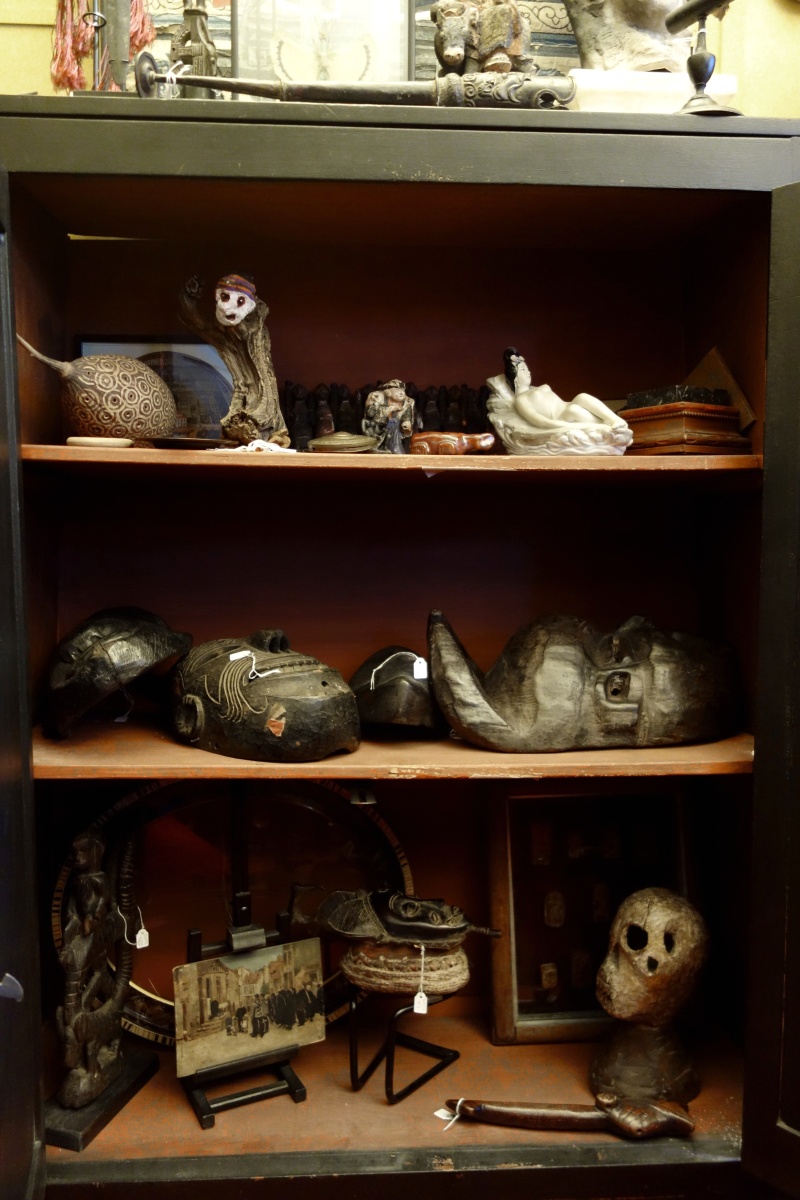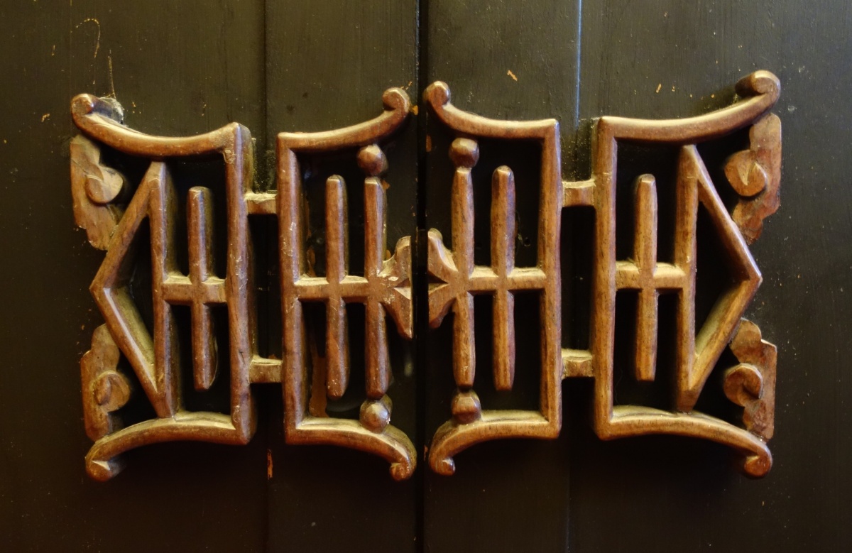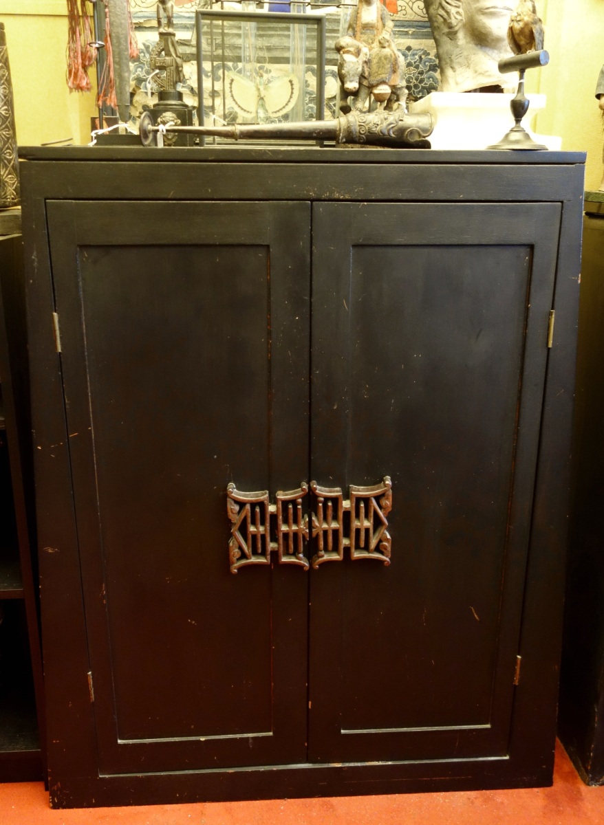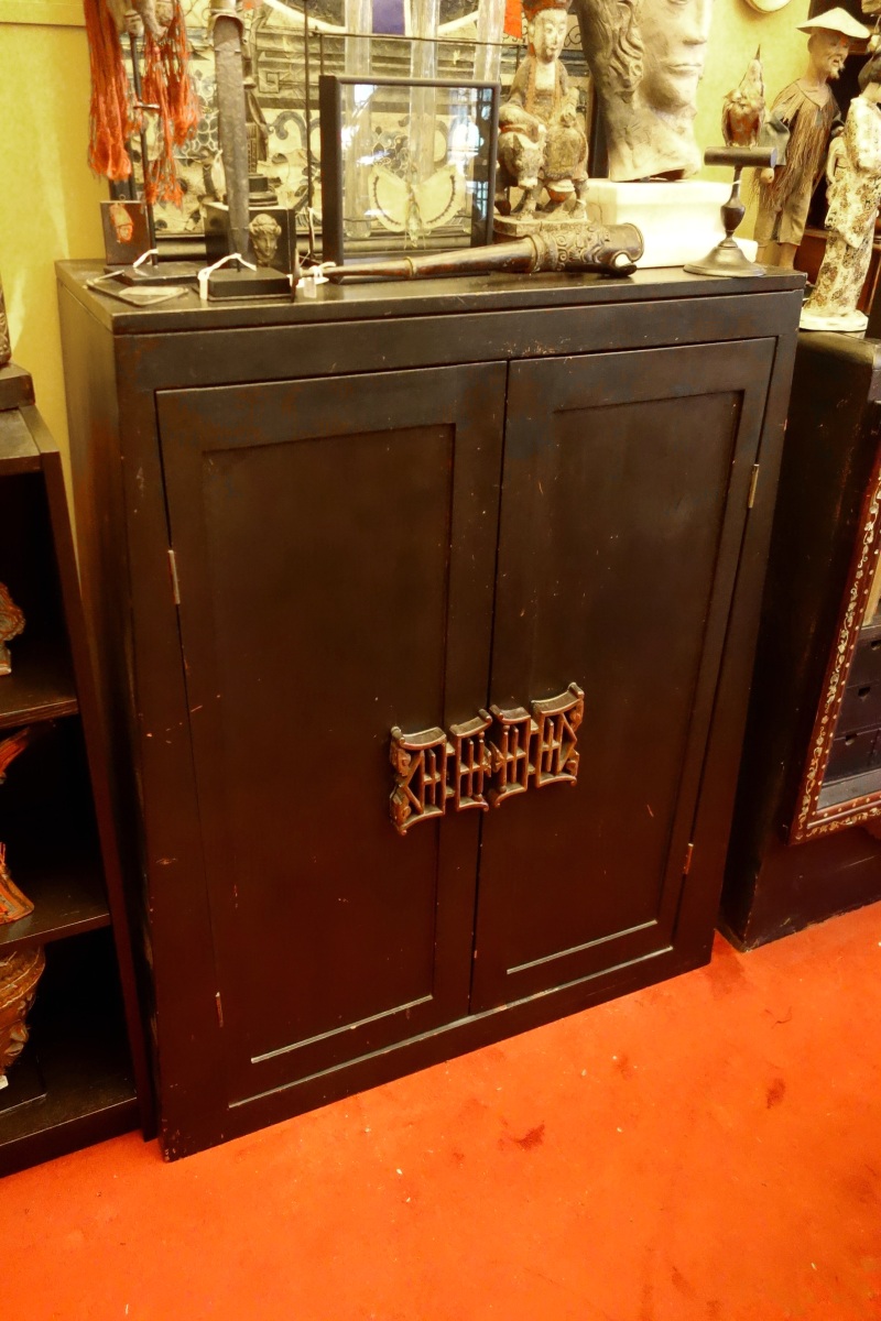 CHINE - Dans le goût de. MEUBLE d'ENTRE-DEUX en bois noirci de forme trapézoïdale aux montants bombés ouvrant par deux portes, les poignées en bois patiné à la façon des idéogrammes chinois.