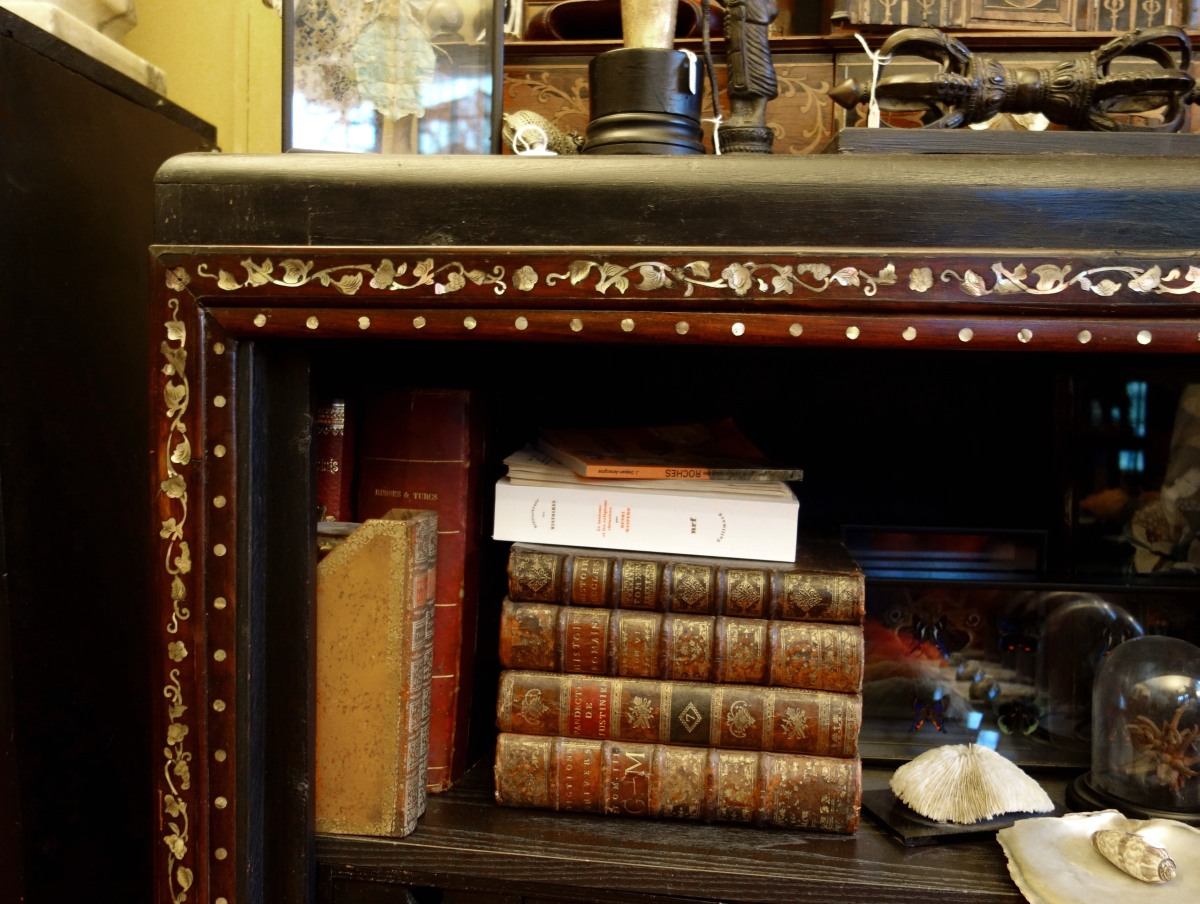 BAHUT de forme rectangulaire en bois noirci, les montants en doucine inversé, ouvrant par une grande niche avec un encadrement en bois de fer (?) finement marqueté de feuillages nacrés.