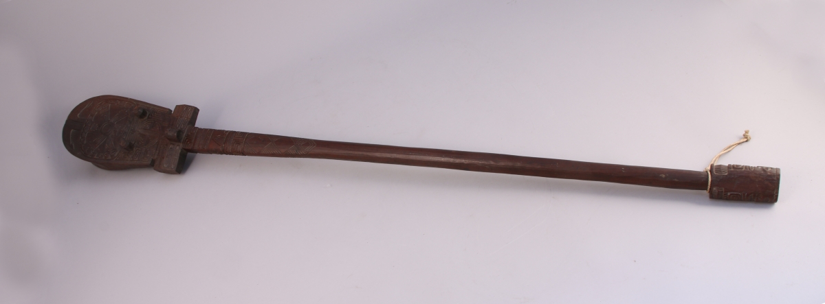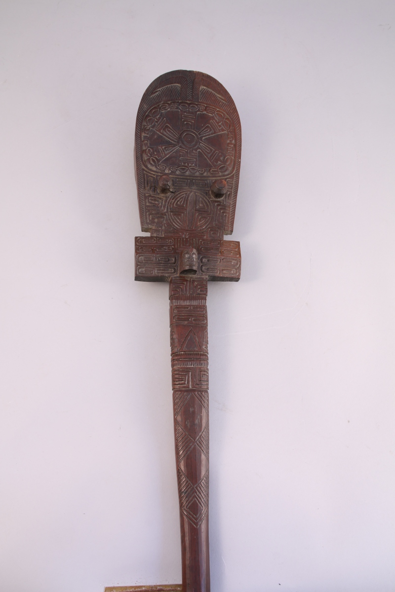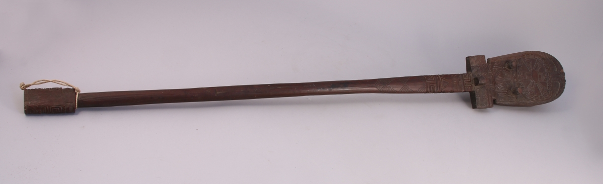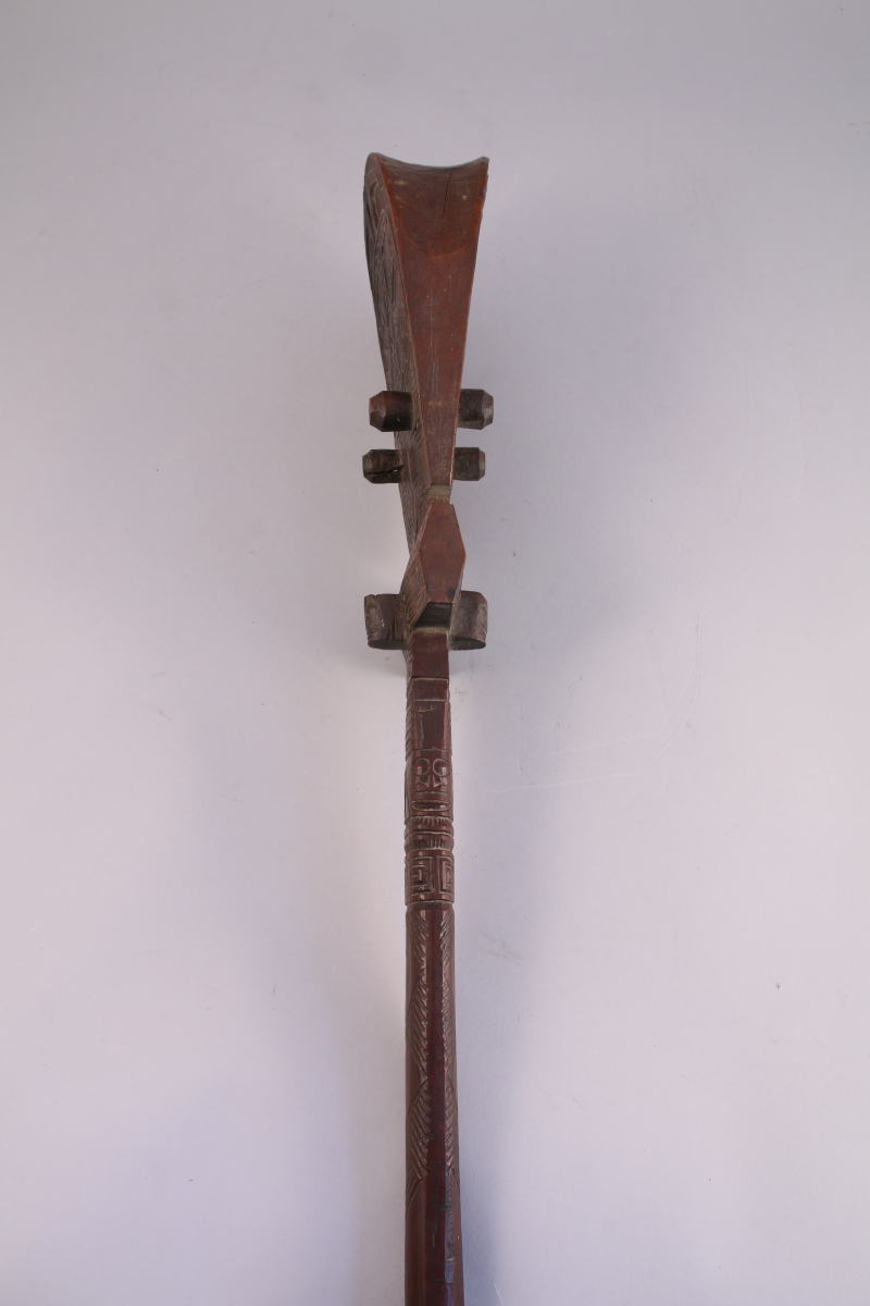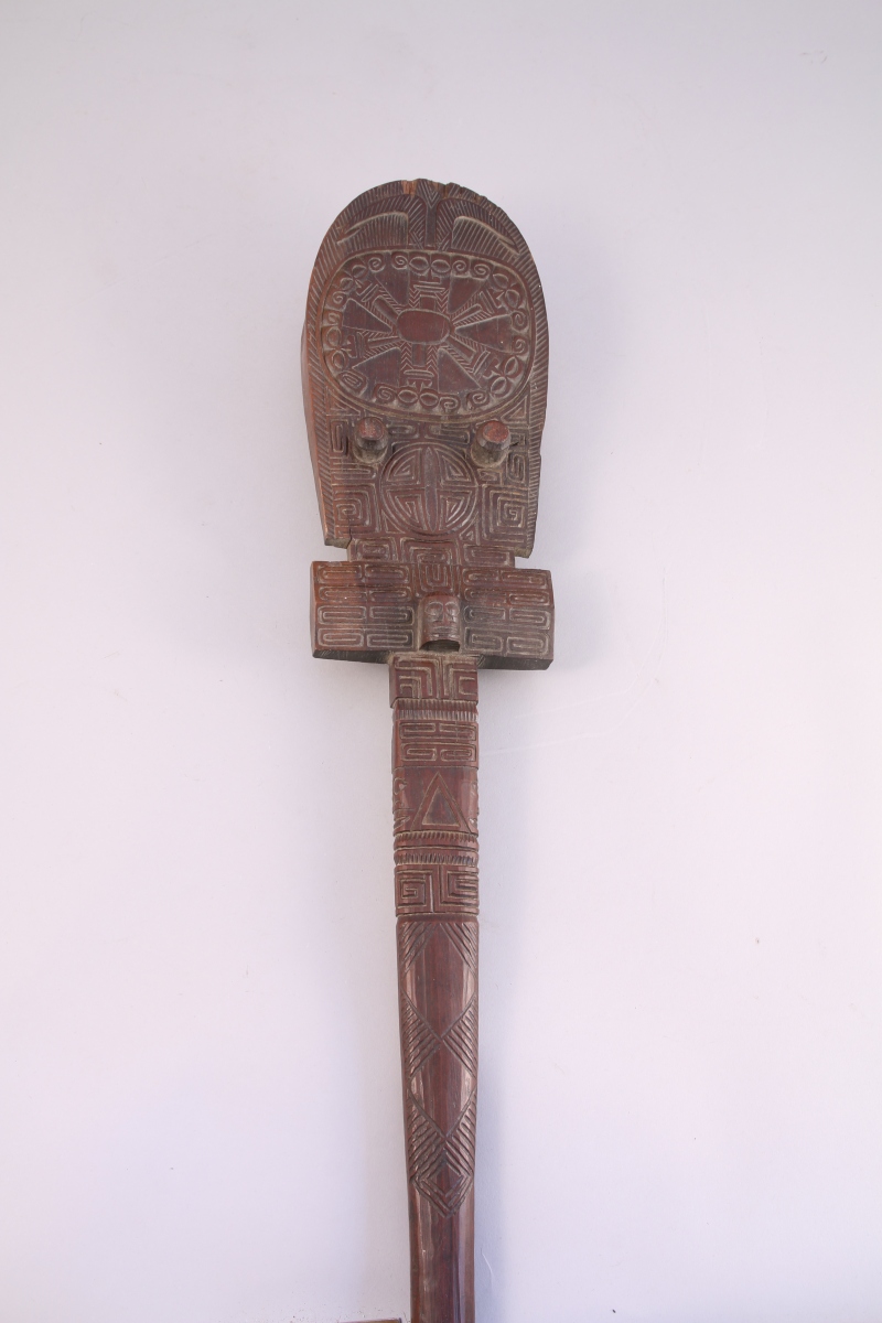 ÎLES MARQUISES - Dernière période, fin XIXe, début XXe - MASSUE U'U. Bois lourd sculpté de têtes de tiki et d'ornements issus de tatouages corporels.