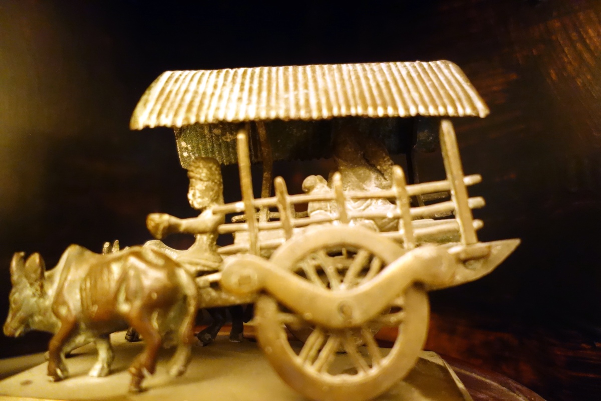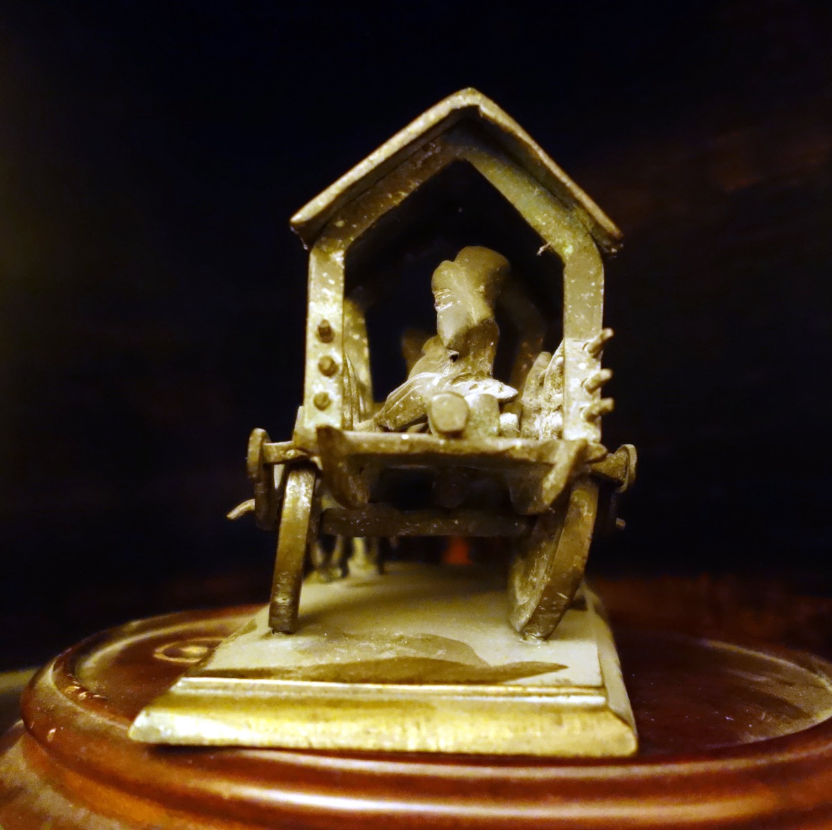 INDOCHINE. CARIOLE en bronze, tirée par deux zébus et deux personnages.