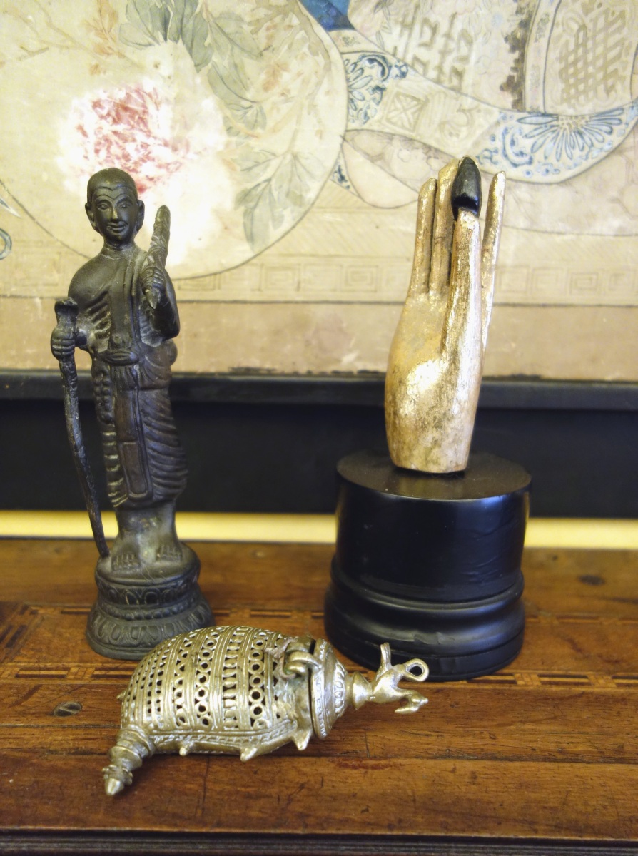 INDOCHINE. MAIN en bois sculpté sur un socle (Haut. 19 cm), FIGURINE en bronze (Haut. 18) ÉTUI en bronze avec un oiseau (Haut. 10,5 cm).