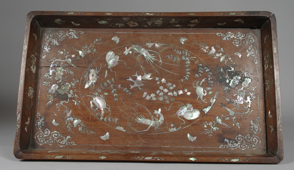 INDOCHINE, Tonkin - Vers 1900. PLATEAU de forme rectangulaire en bois incrusté de nacre à décor de crabes, langoustes et poissons dans une réserve ovale entourée de fleurs et oiseaux.