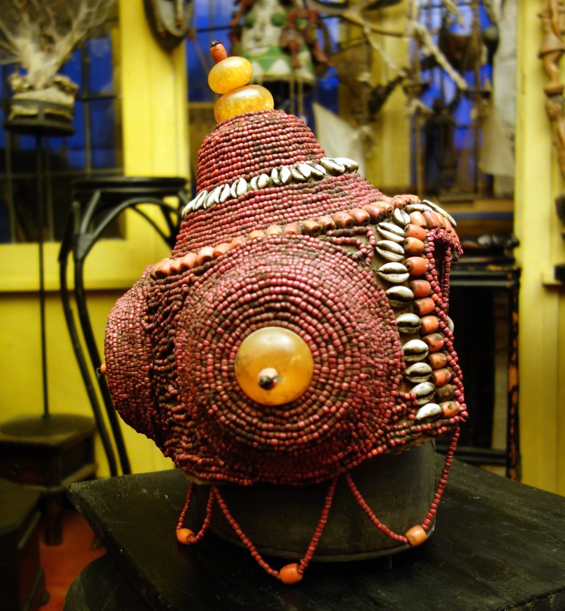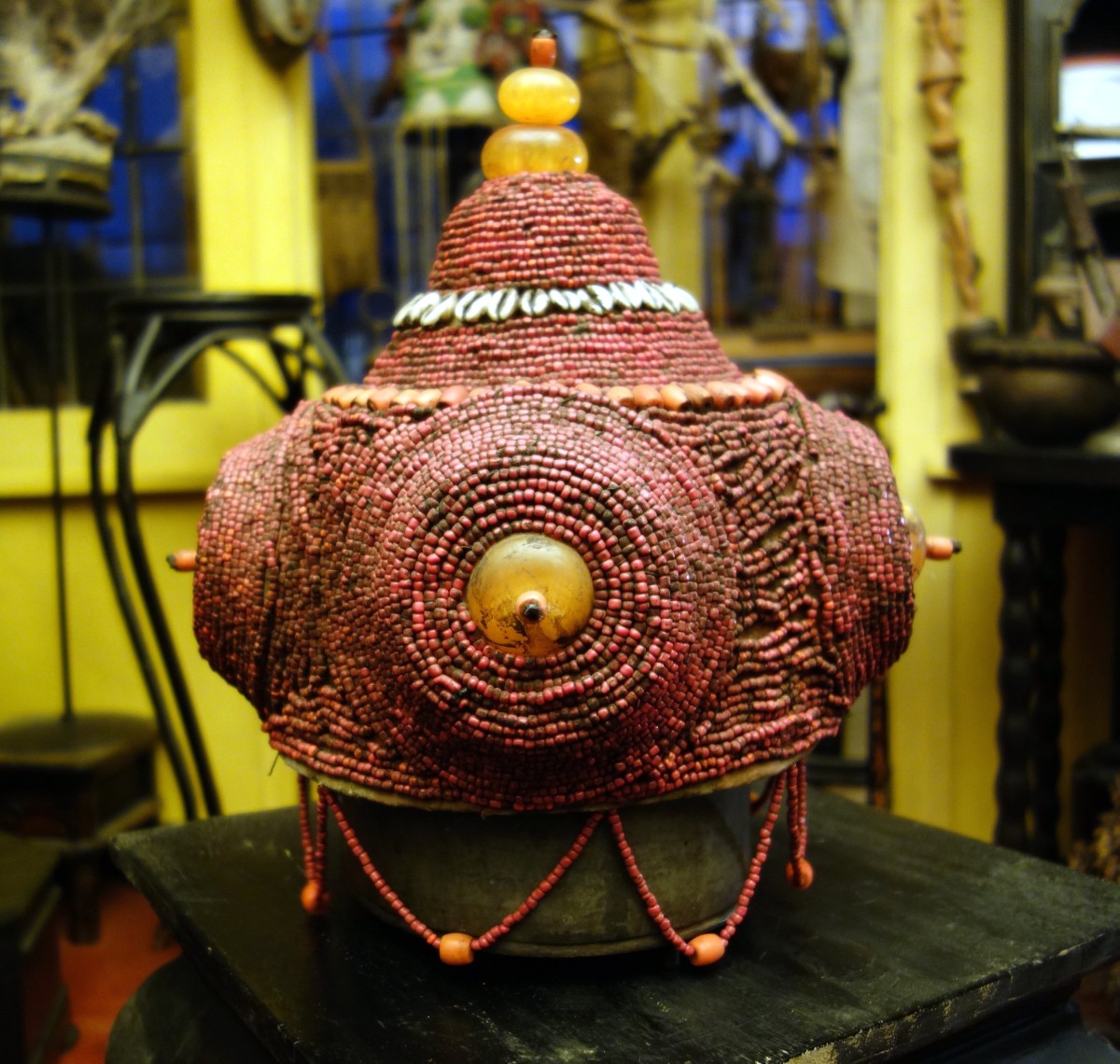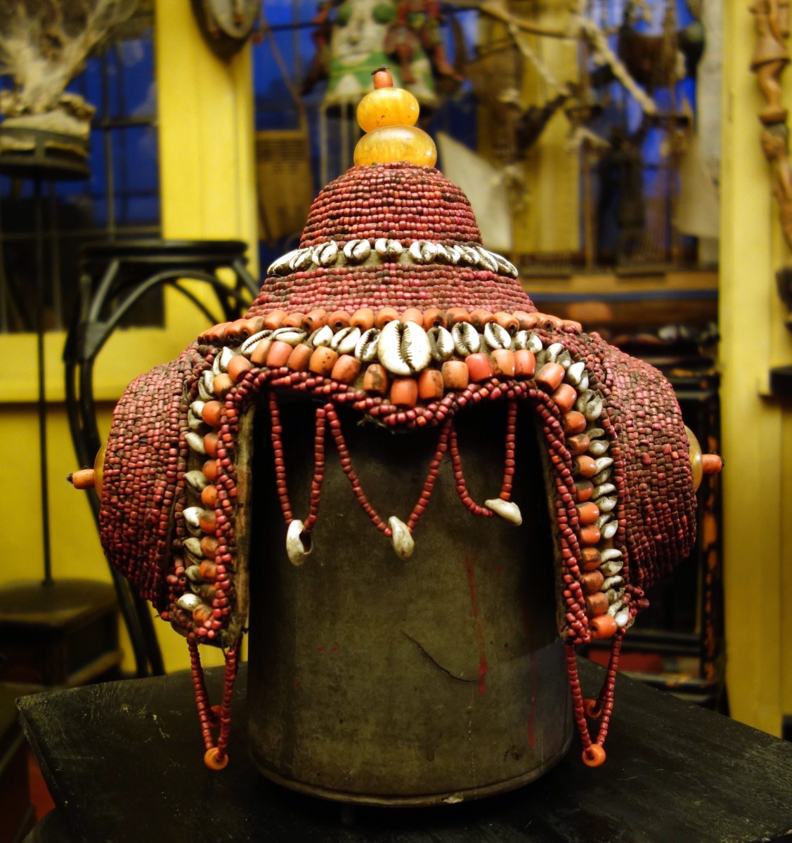BIRMANIE. COIFFE en coquillages, perles, graines et ambres.Sur un présentoir...