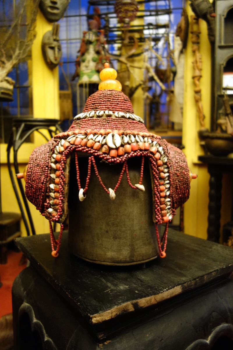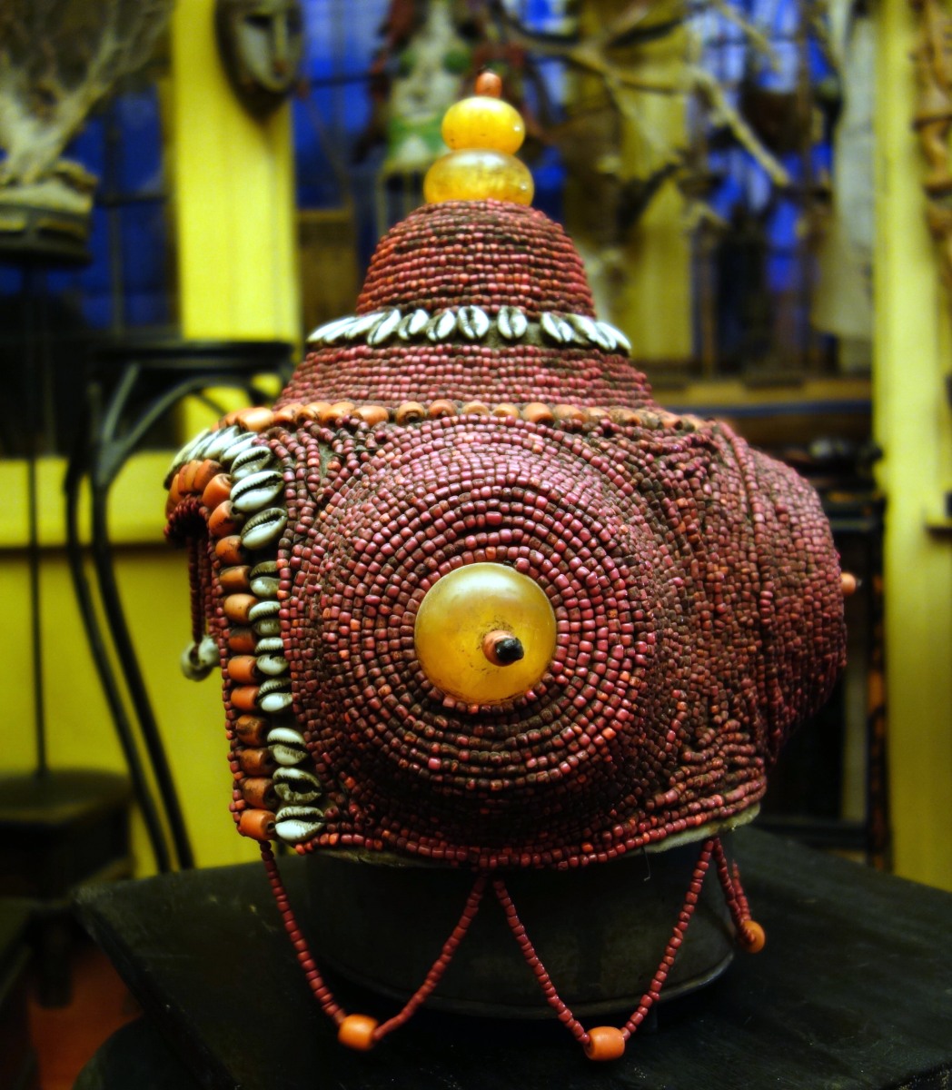 BIRMANIE. COIFFE en coquillages, perles, graines et ambres.