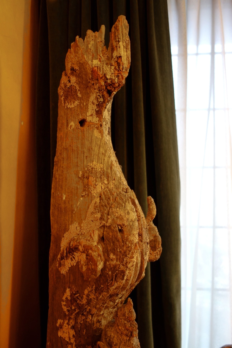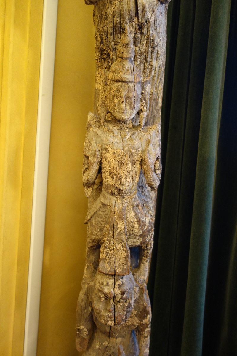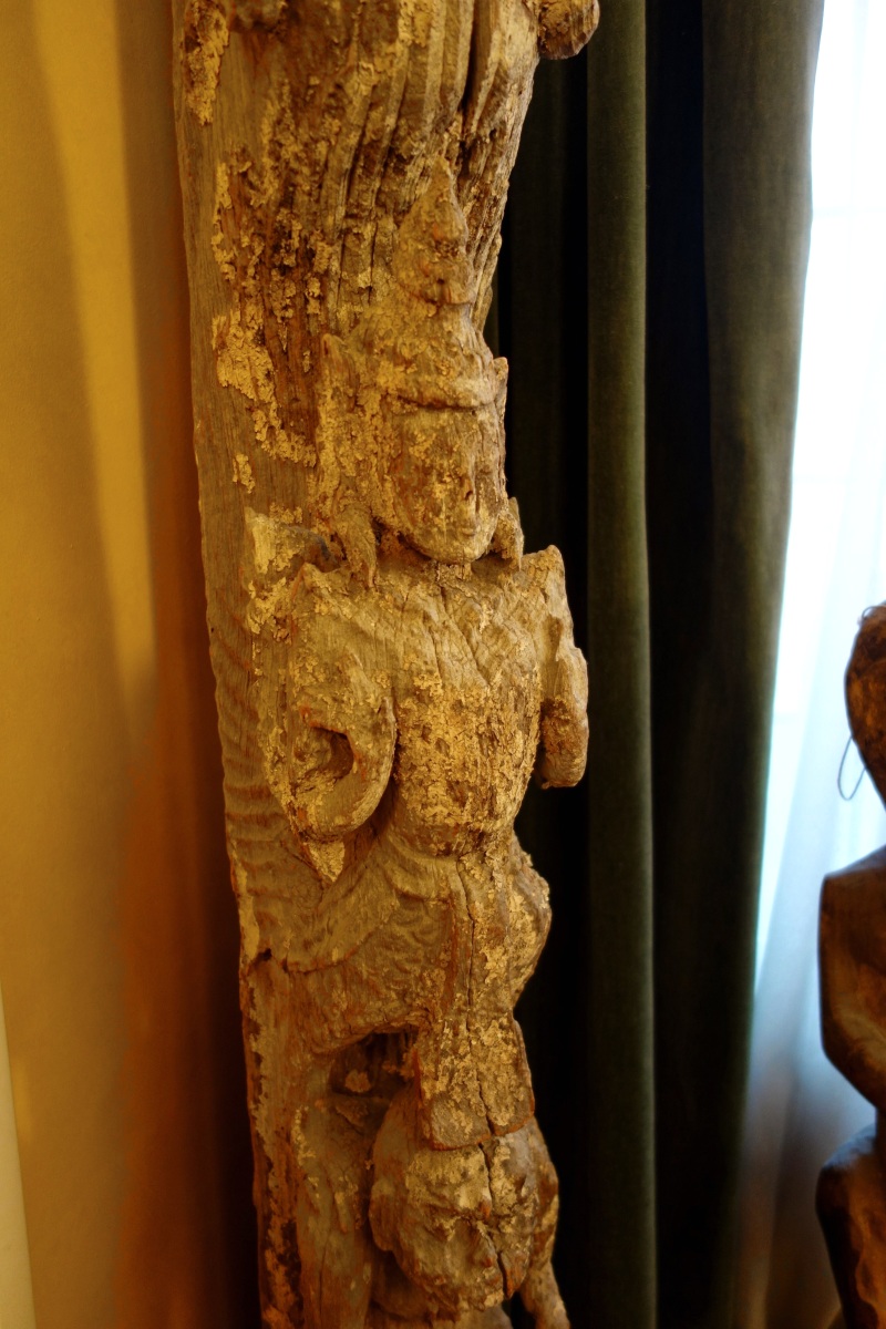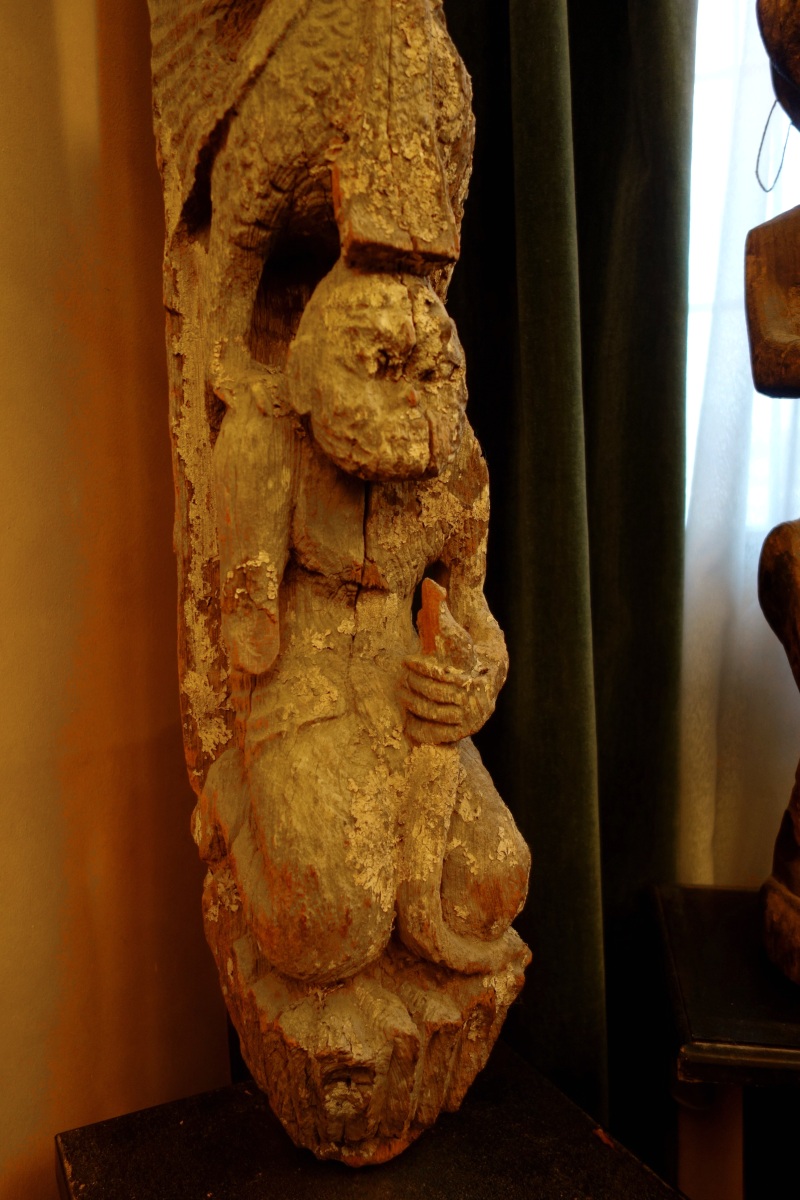 BIRMANIE - SHAN - XVIIe. SCULPTURE SHAN KINNARI figurant l'oiseau sacré au buste et visage féminin (Garuda) posé sur les épaules du roi des singes (Hannuman) en bois de teck sculpté.