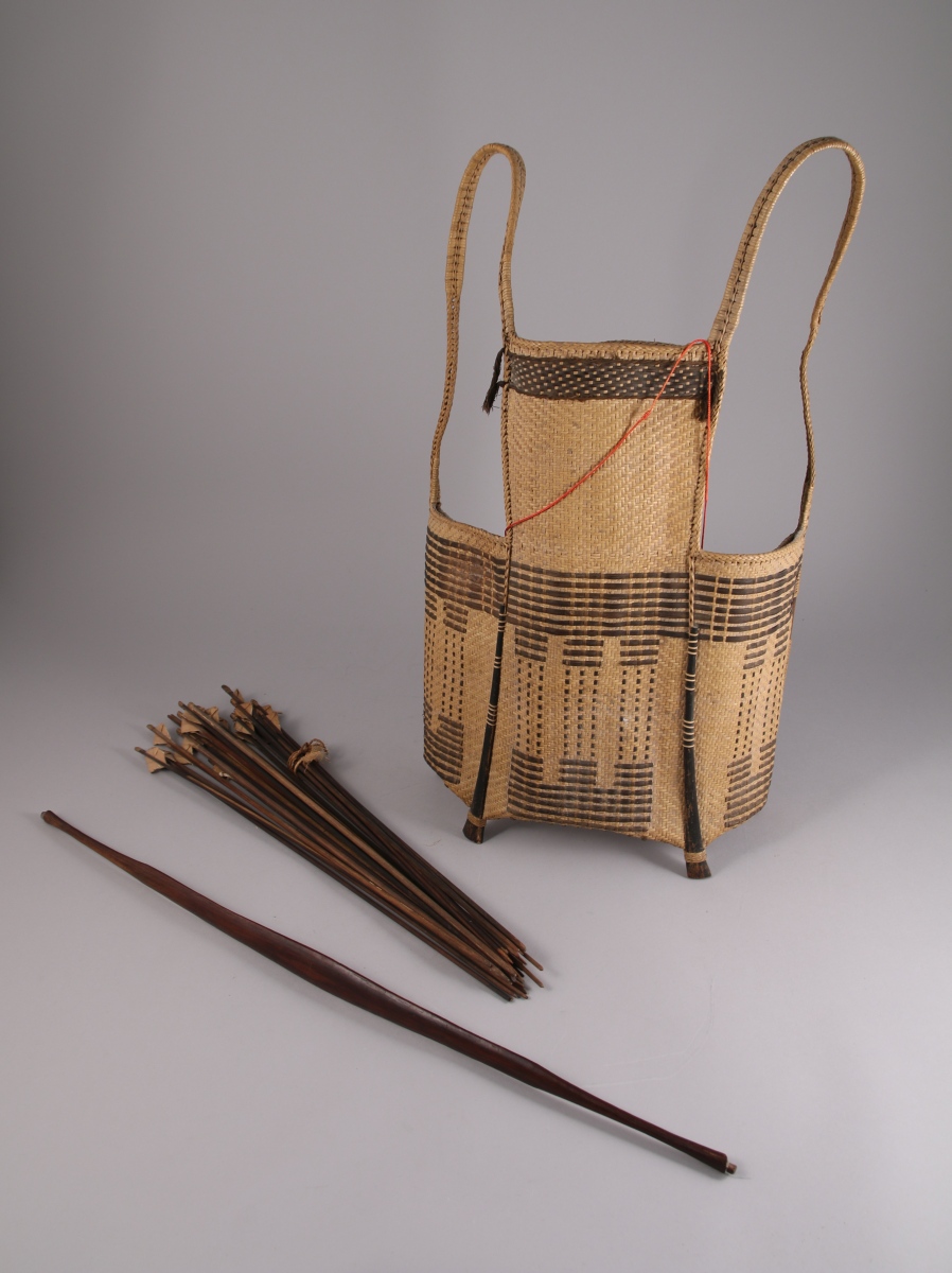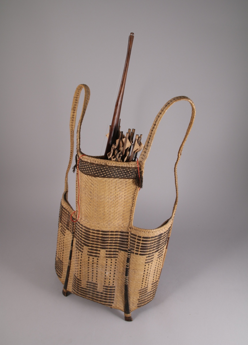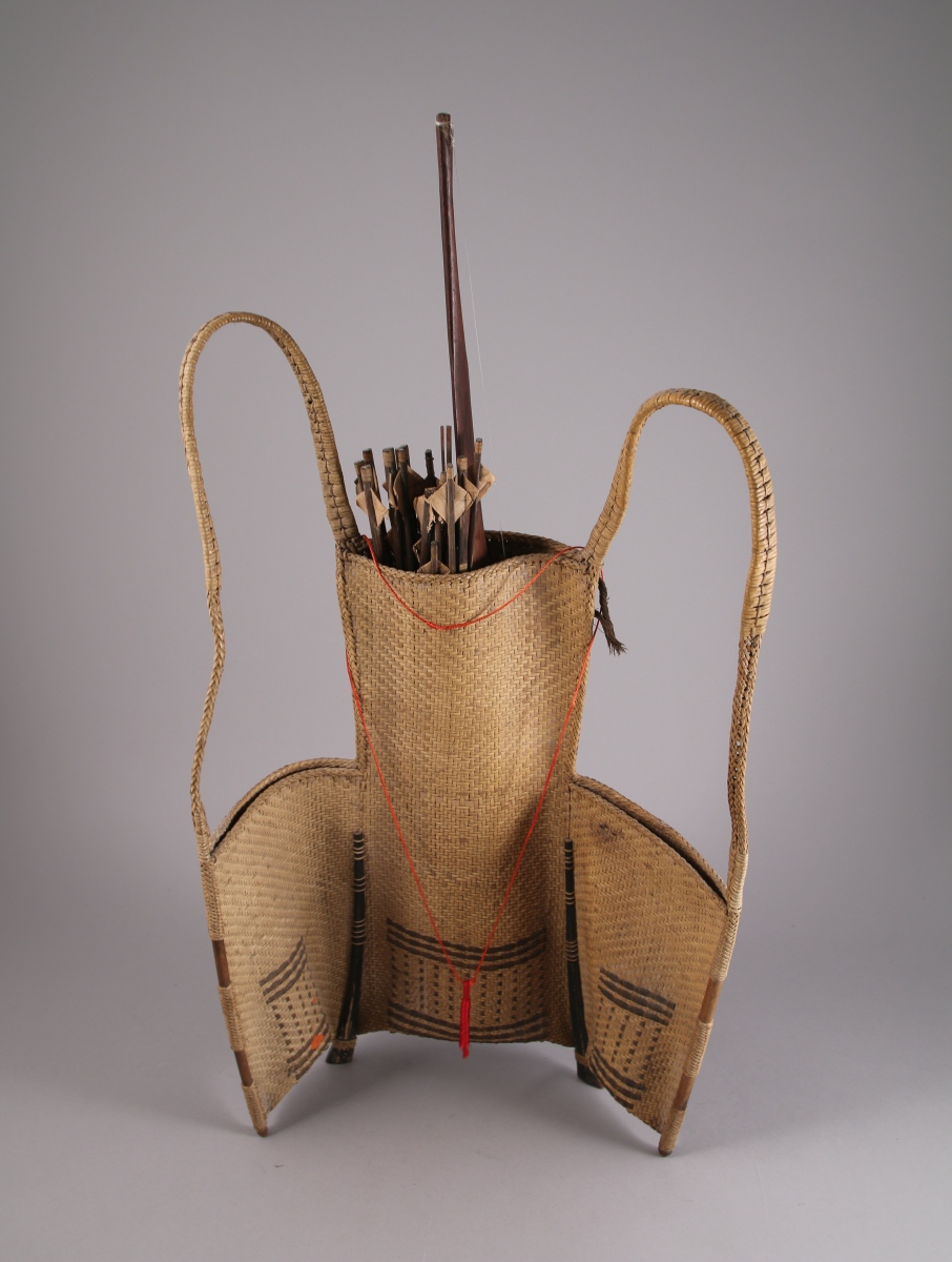 INDOCHINE. CARQUOIS-GIBECIÈRE en vannerie avec 31 FLÊCHES et un ARC.