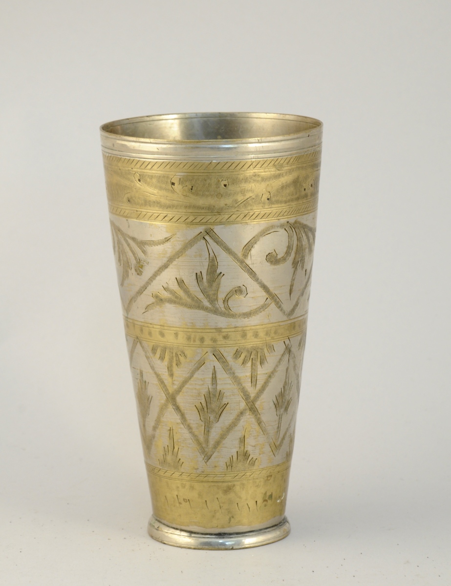 INDE - XXe. VASE À LASSI de forme tronconique en laiton et laiton argenté. Le col souligné de filets. Il reçoit un décor de rinceaux, feuillages stylisés, dents de loup et losanges.