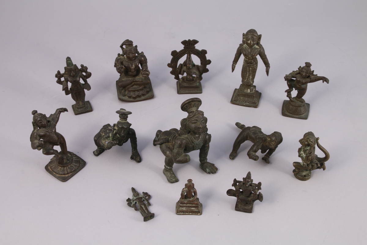 INDE, RAJASTHAN, XIXe. Ensemble de TREIZE STATUETTES de divinités, notamment Shiva debout ou assise en laiton.