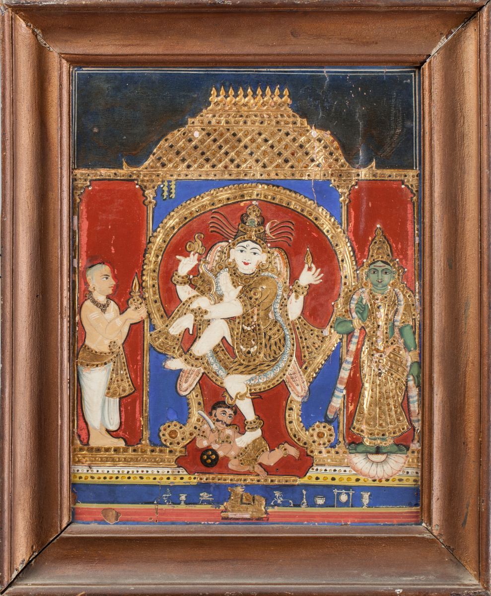 Le dieu est représenté en train d'effectuer sa danse cosmique, piétinant le démon de l'ignorance Apasmârapurusa au sein d'une architecture sacrée. Il est entouré de son épouse Parvati et d'un officiant qui lui rend le culte. A ses pieds, Nandin, le taureau et son véhicule est allongé entre des représentations d'offrandes. Les parures et l'architecture sont traités " a pastiglia " et dorés.