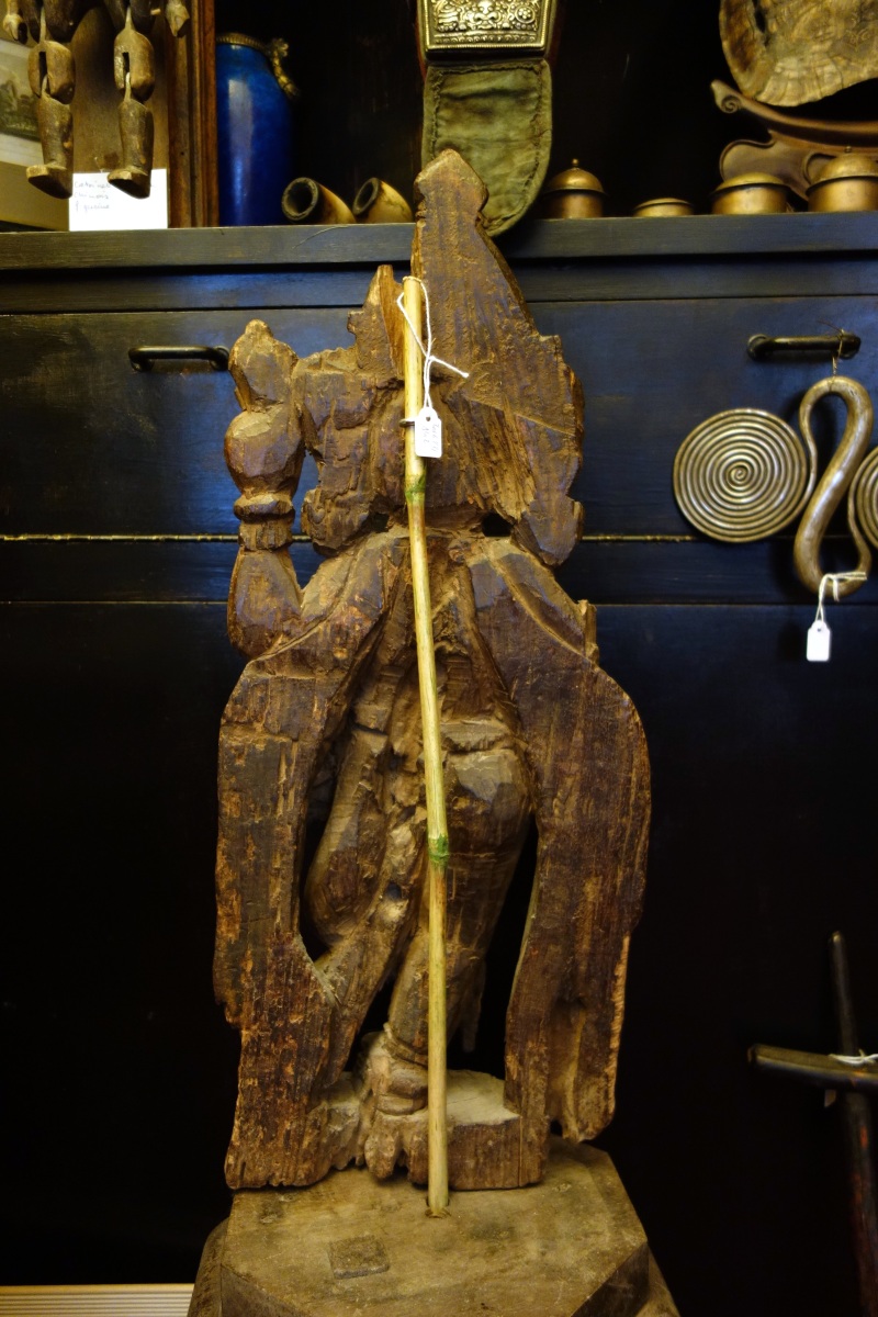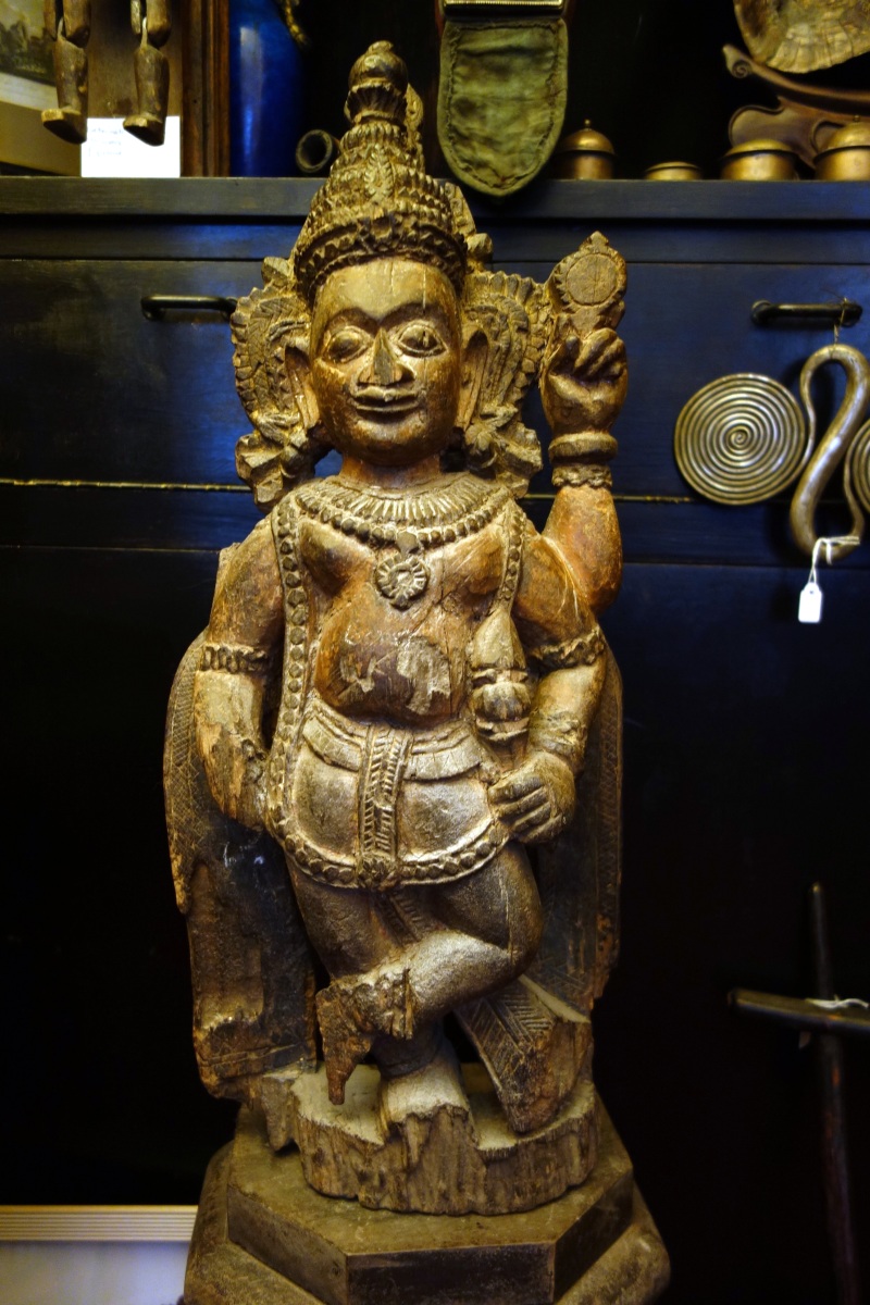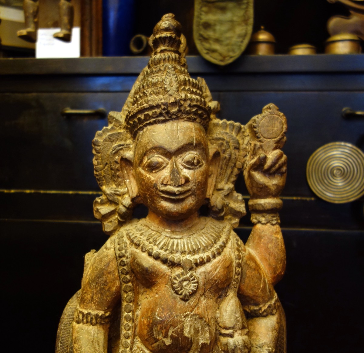 INDE. ANCIEN ÉLEMENT de RETABLE figurant SHIVA (?) en bois sculpté, traces de polychromie, la divinité richement parée, portant ses différents attributs.
