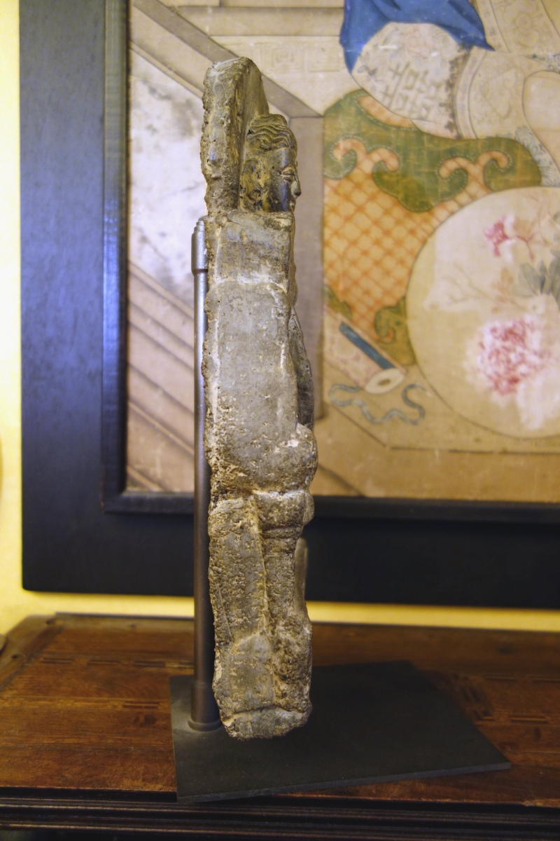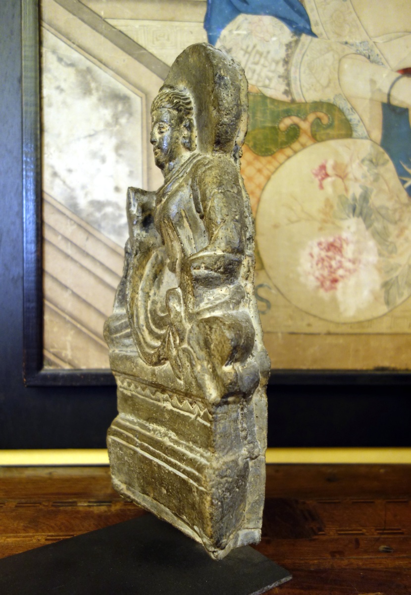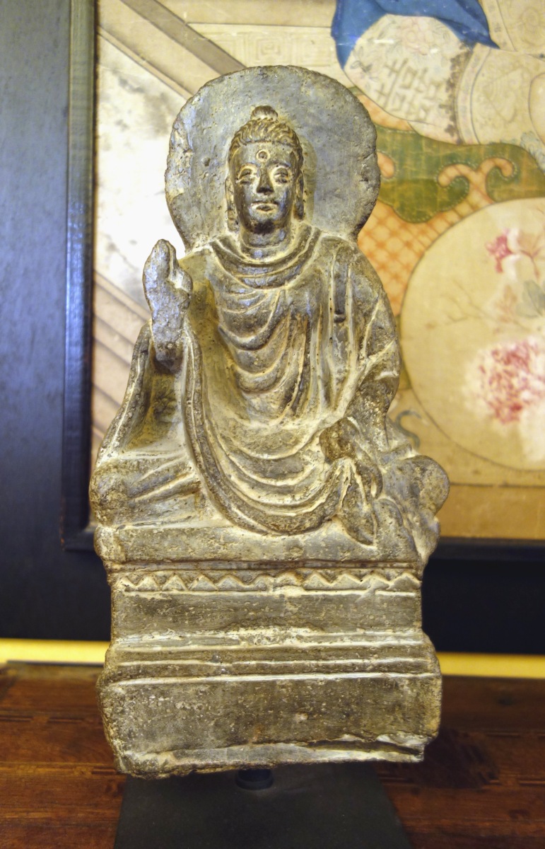 GANDHARA. BUDDHA bas-relief en schiste gris, faisant le geste de l'absence de crainte (abhaya-mudra).