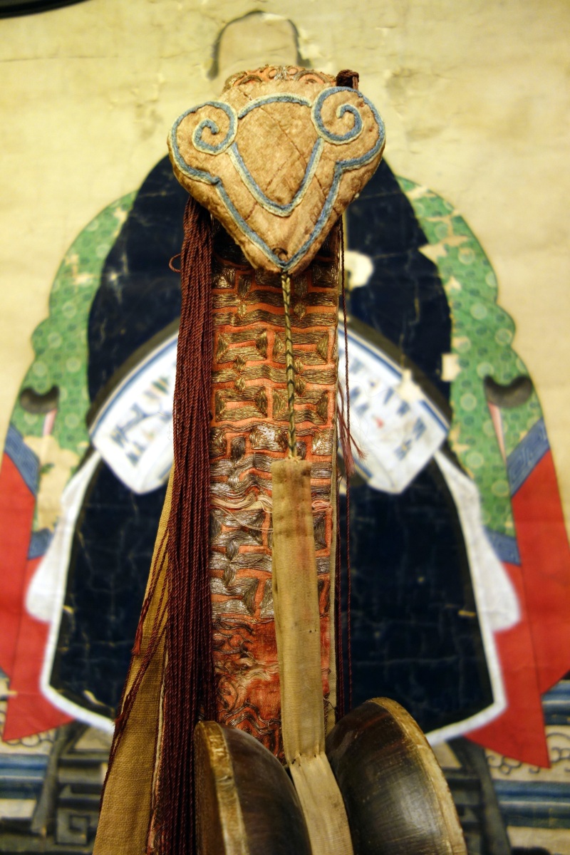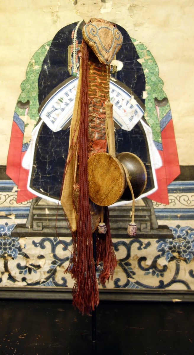 TIBET? TAMBOURIN rituel, bois, peau et une ceinture en soie tressée d'idéogrammes avec des fils d'or. Monté sur un socle.