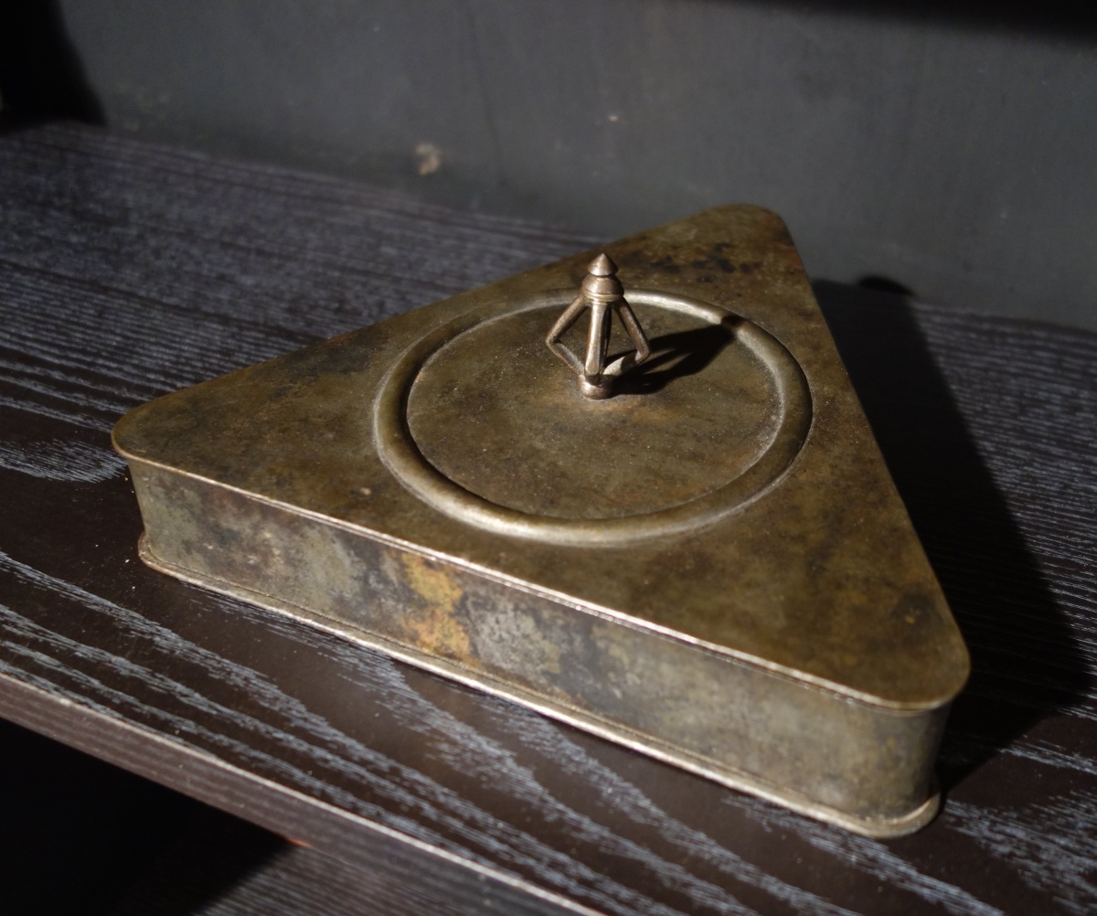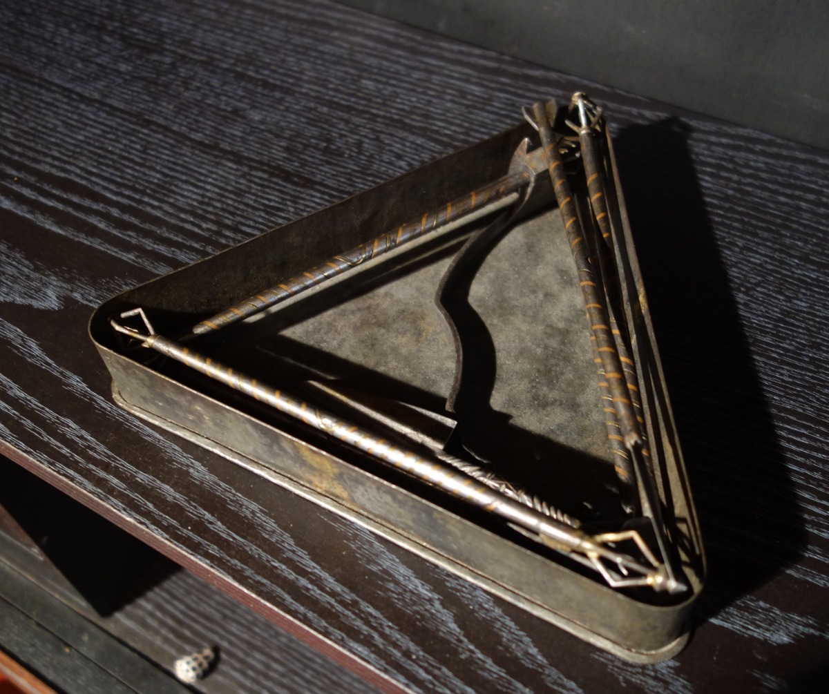 TIBET - XVIe? BOITE TANTRIQUE de forme triangulaire en métal avec ses accessoires rituels, haches, pointes en fer.