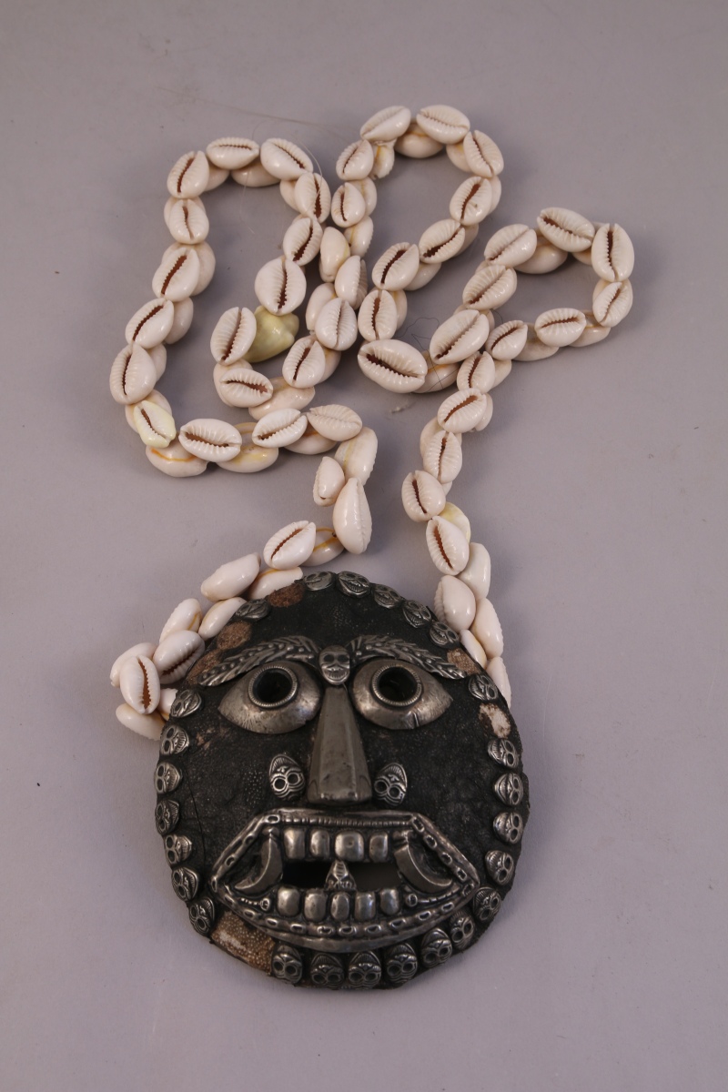 Haut.12, Larg. 10,5 cm. Monté en pendentif, le collier en cauris.