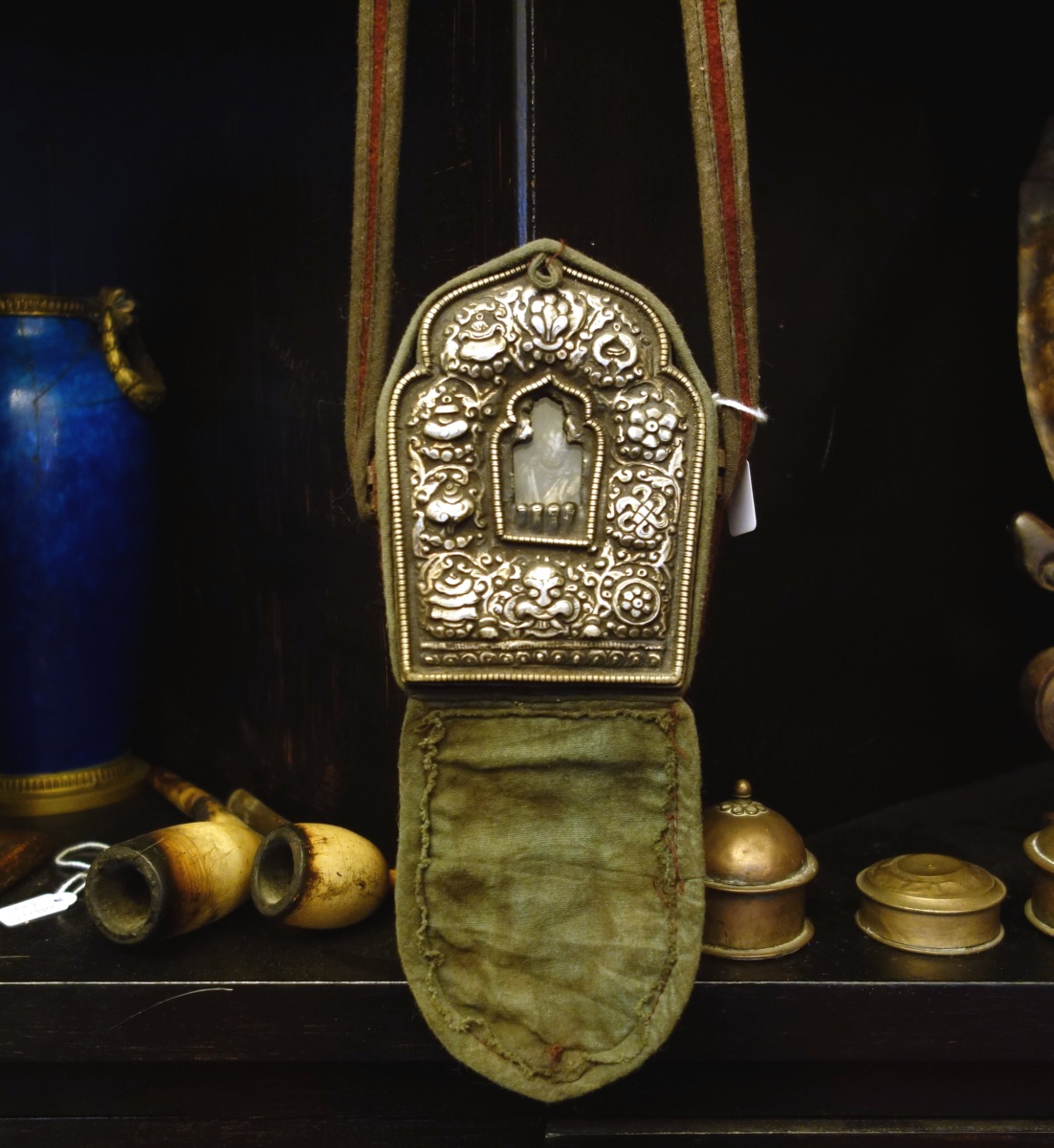 TIBET. RELIQUAIRE de VOYAGE Bouddhique, en cuir et métal argenté, une logette laissant voir le Buddha, ceinte d'un décor de fleurs.