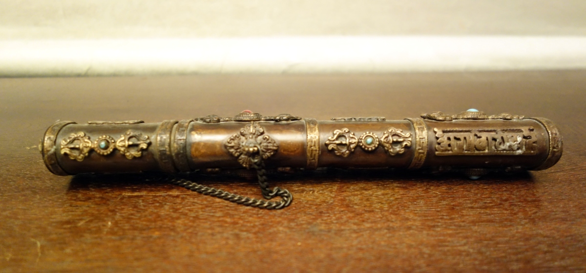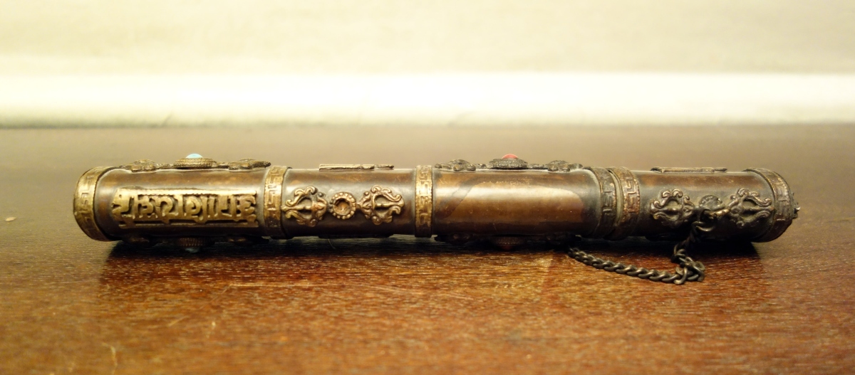 TIBET? ÉTUI en bronze, cuivre et rehauts de pierres dures.