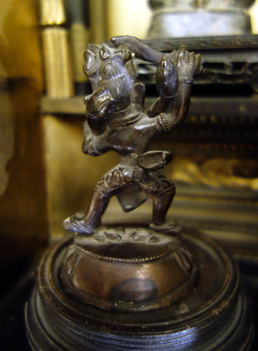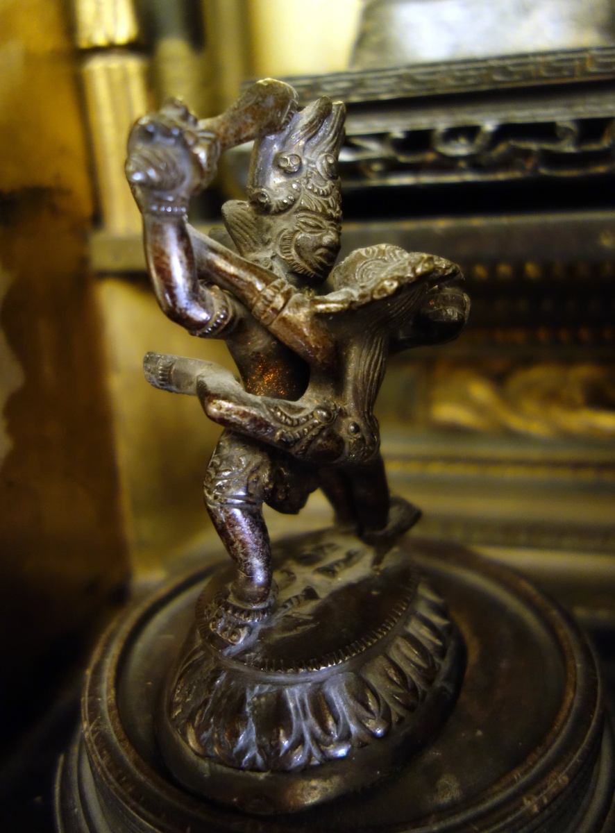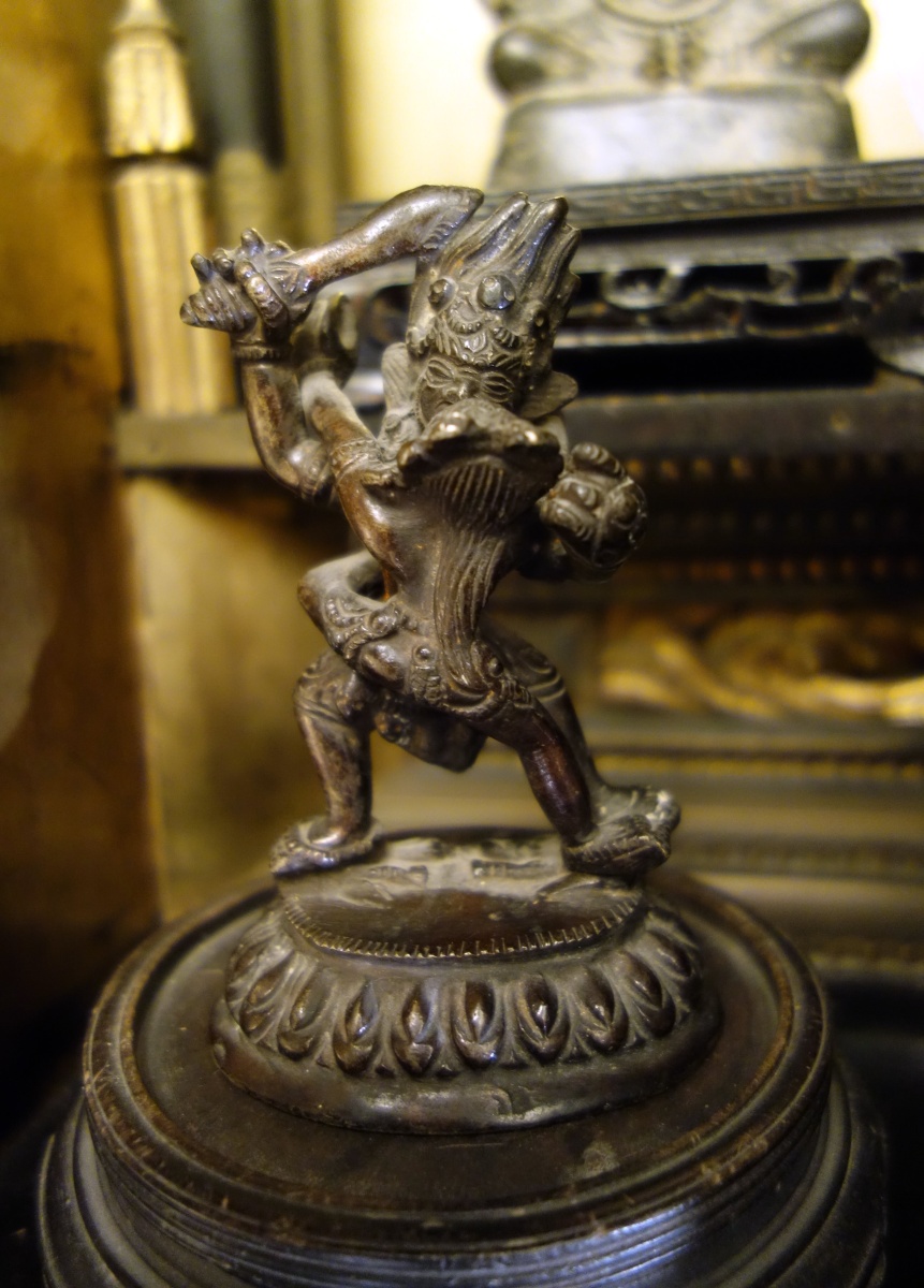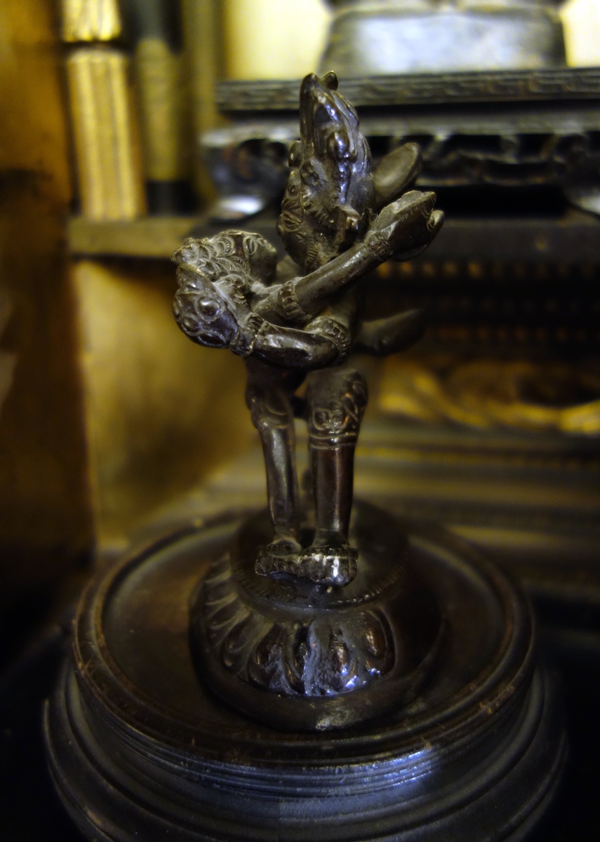 TIBET - Fin XIXe siècle. Statuette en bronze à patine brune représentant MAHAKALA et sa SAKTI en yab-yum sur un lotus.