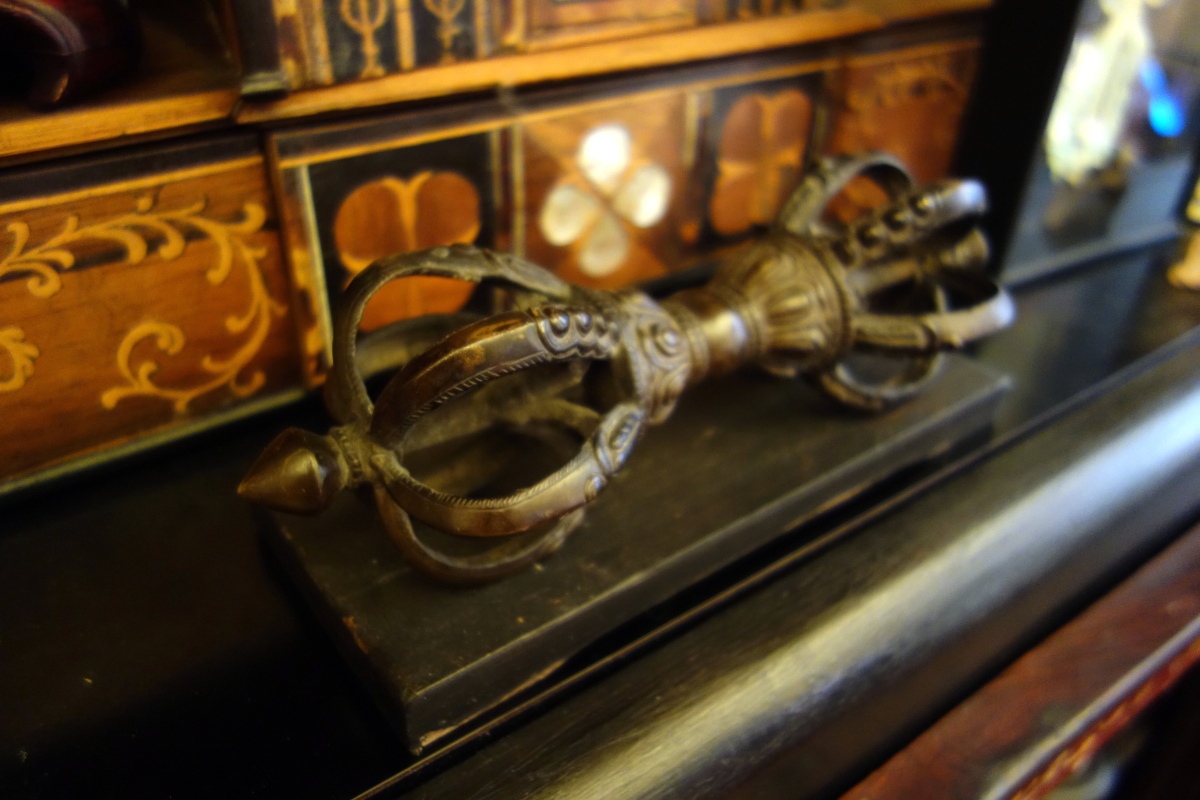 Le Vajra est le foudre diamant symbole bouddhique tantrique. Il représente la compassion et les moyens à mettre en œuvre pour l'éveil. Il est tenu dans la main droite, symbole du masculin. La main gauche tient la clochette, symbole du féminin.