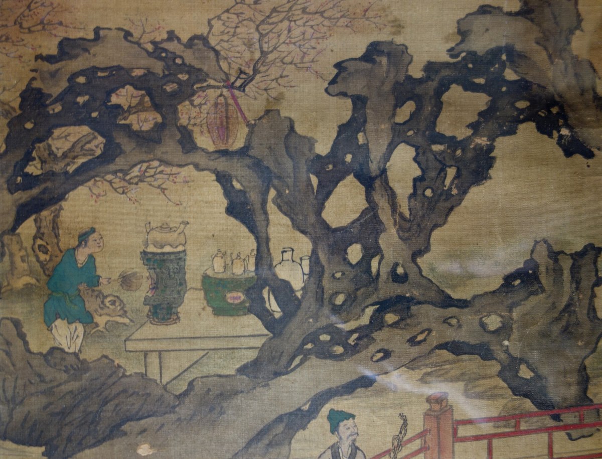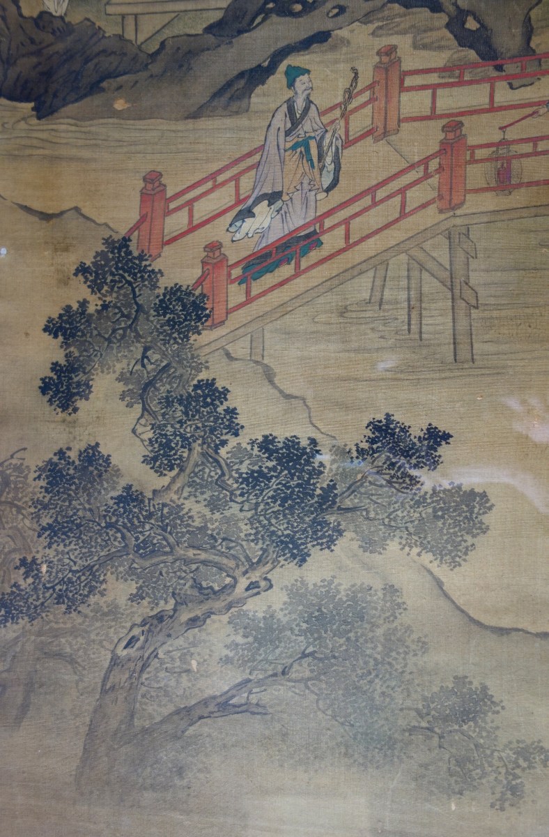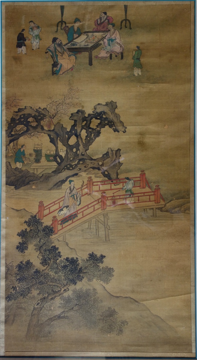 CHINE - XXe. Encre et couleur sur soie, représentant des lettrés dans un jardin avec leurs serviteurs.