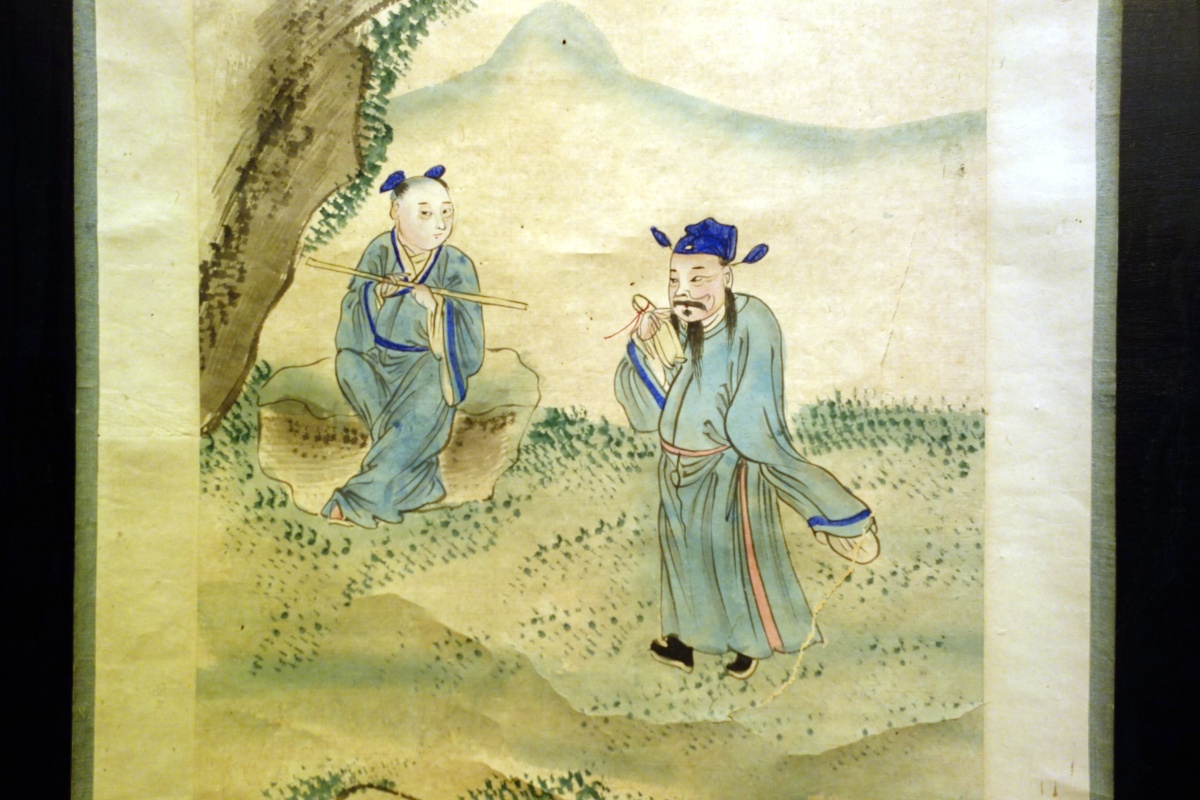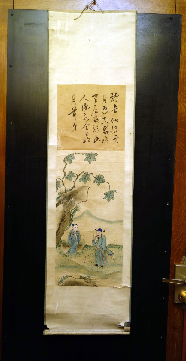 CHINE. ROULEAU peint de deux personnages dans les champs, une inscription manuscrite.