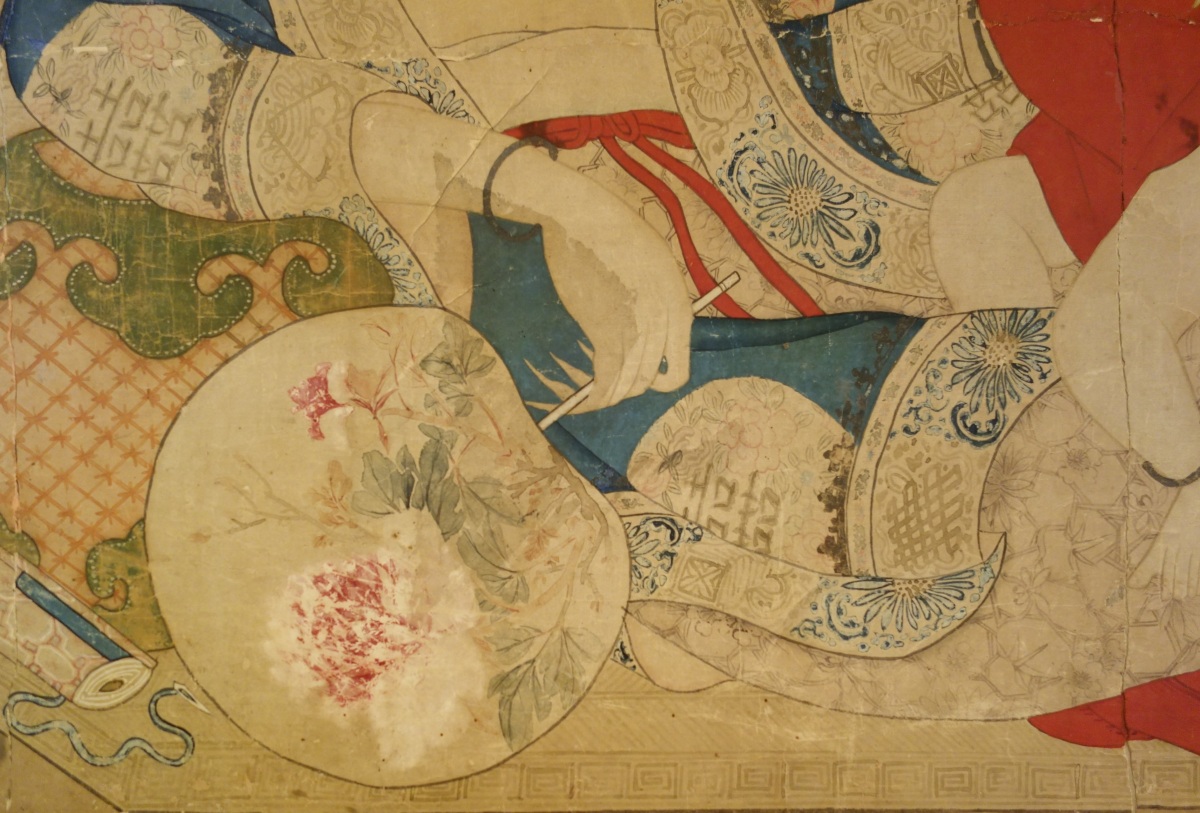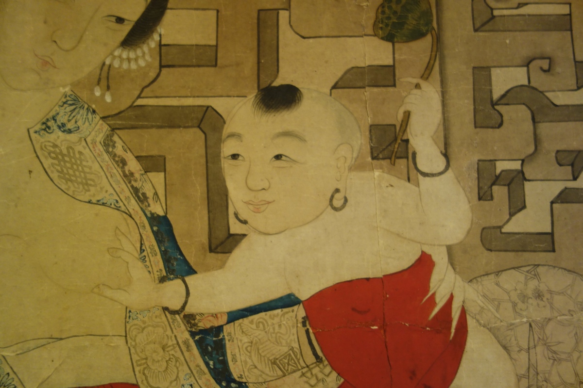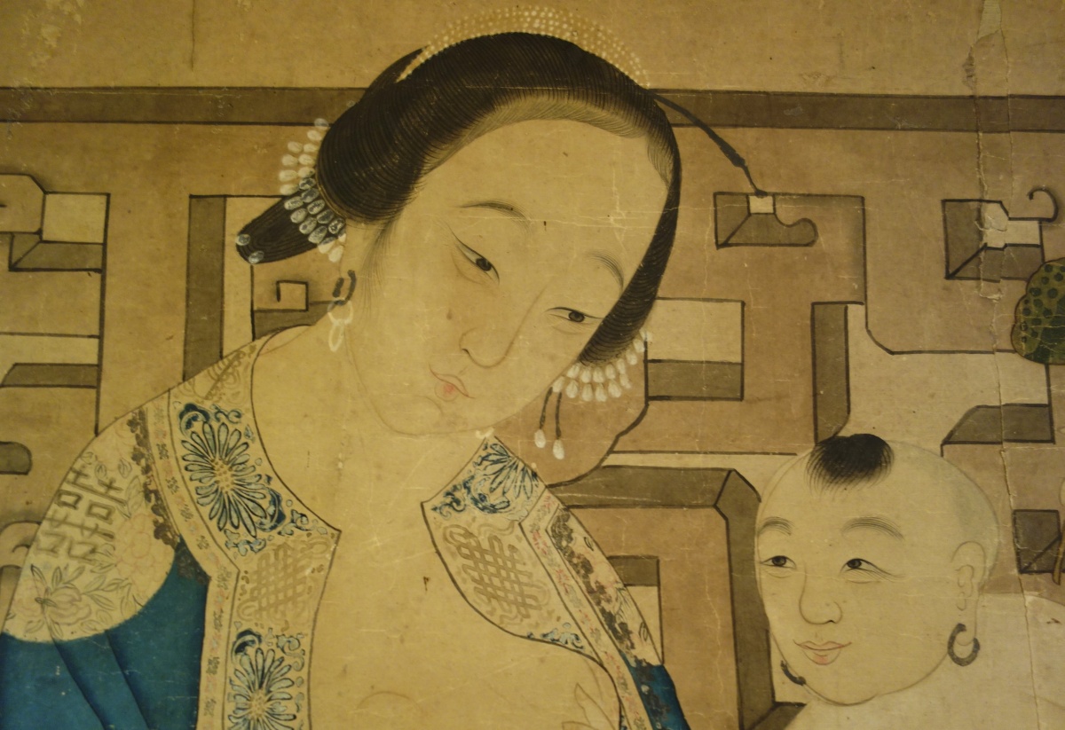 CHINE - Début XIXe. Encre et couleurs, femme allaitant.