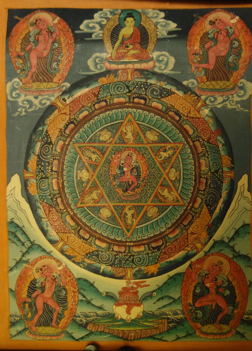 CHINE - XXe siècle. Petit MANDALA, détrempe sur toile, Heruka dans une étoile.