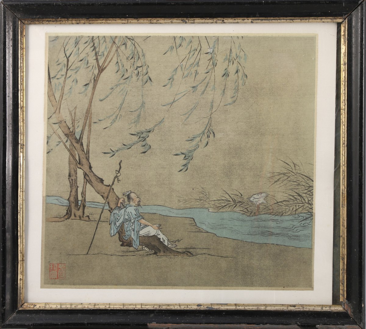 CHINE - XXe. ESTAMPE. Lettré observant une grue au bord d'une rivière. Cachet en bas à gauche, un tampon au dos.